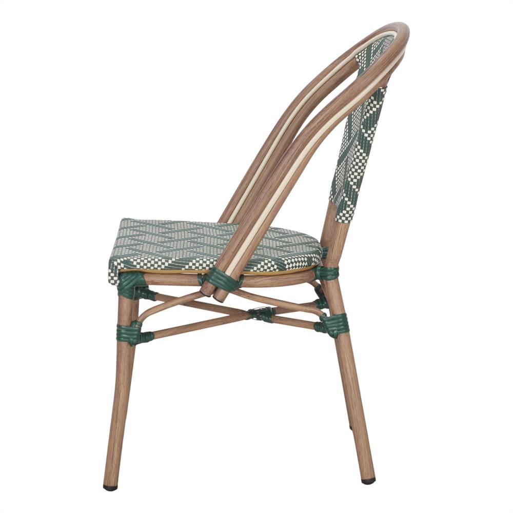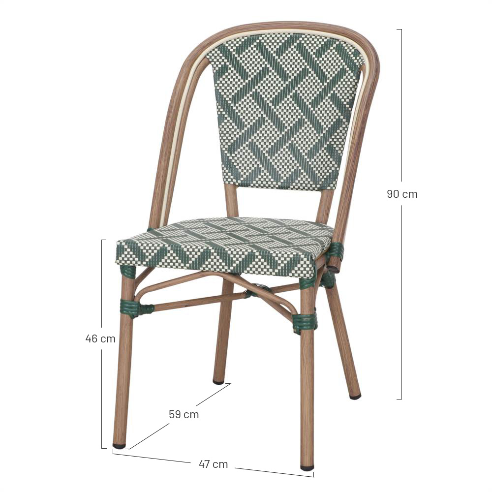 The structure is made of tubular aluminum, a durable and lightweight material, ideal for outdoors. Its imitation bamboo finish not only adds aesthetic warmth, but also adds a natural and exotic touch, evoking the charm of traditional cafés. Both the seat and backrest are made of synthetic rattan pith, a material that offers the appearance of natural rattan but with greater resistance to weathering and wear.