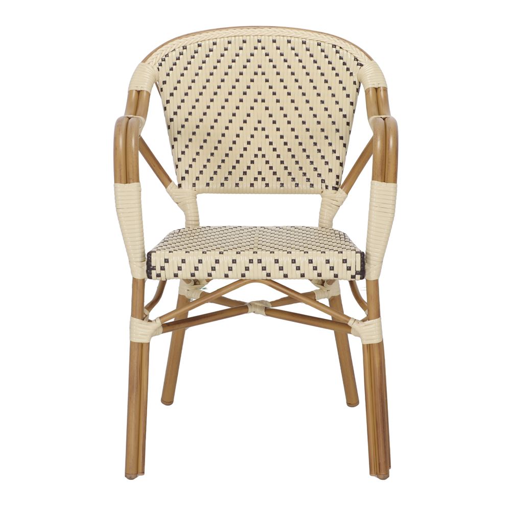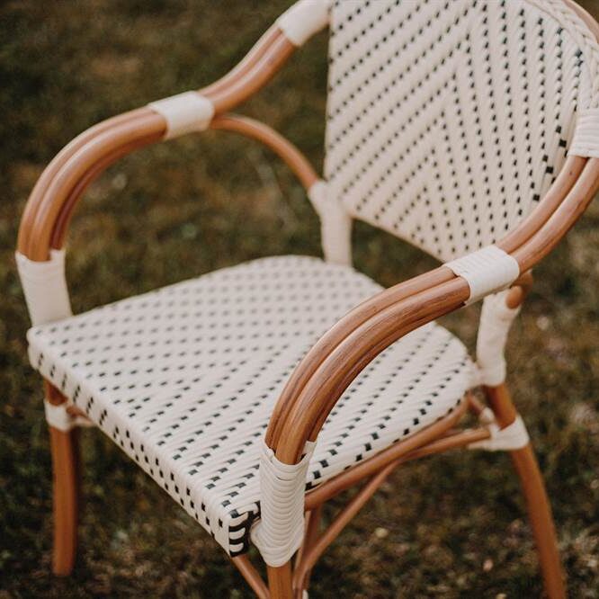 Our Bistro-style Angeles outdoor chair is made of aluminum with a faux rattan and synthetic pith finish. Synthetic rattan is about to make its way into any outdoor setting, and it’s no surprise: its solid weave lends texture to the look and has been used in some of the most iconic designs in decorating history. In this outdoor chair, synthetic rattan brings a more contemporary feel than traditional rattan and is easy to maintain. Perfect for a patio, deck or garden. Mix it with other Bistro style furniture for the perfect combination. Its unique design is the recipe for an original piece that will add a Parisian touch to your space.