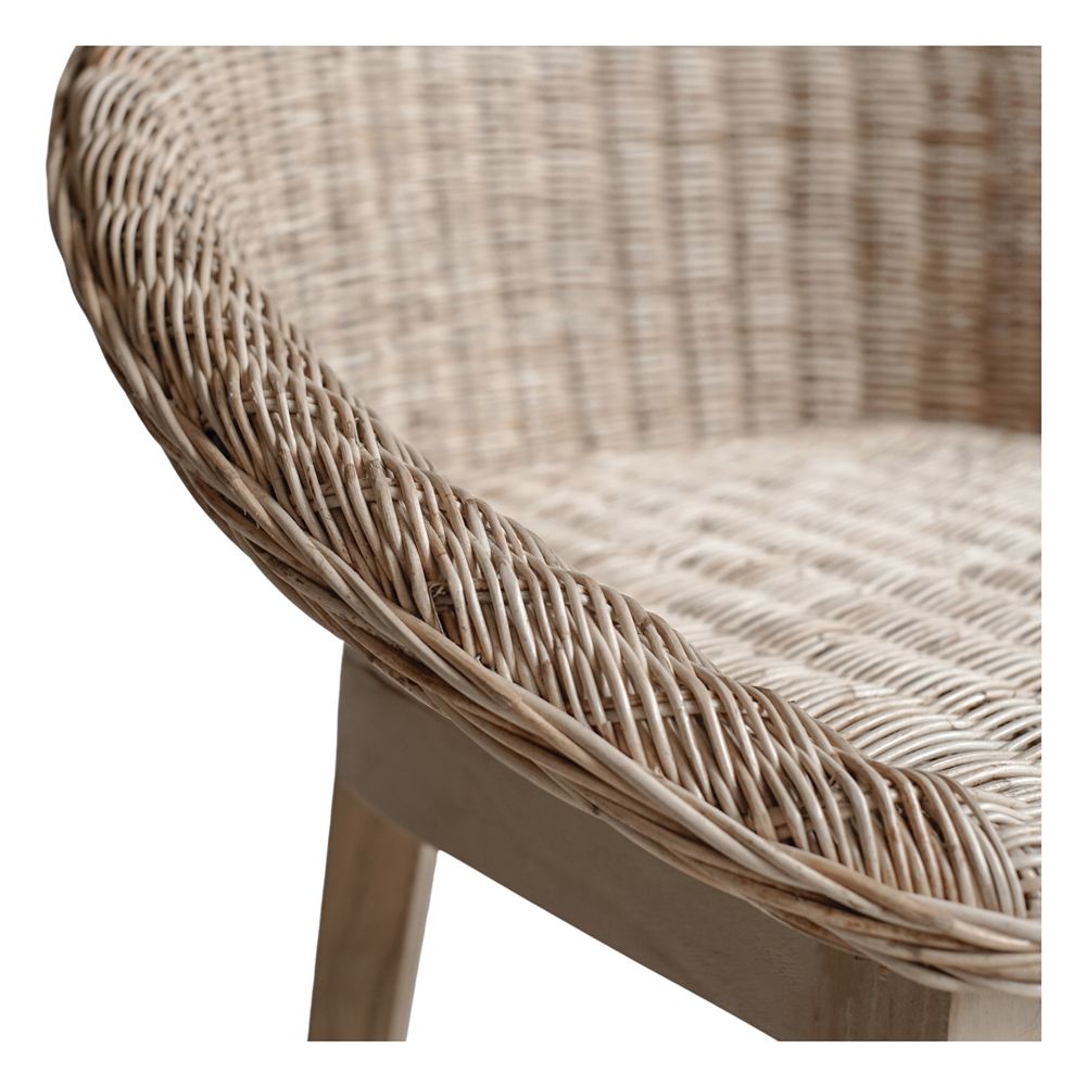 The structure is made of solid teak, a noble wood that stands out for its strength and durability. Its natural finish enhances the grain and adds warmth to the piece, ensuring stability and firmness even with continuous use. This solid base is complemented by the seat and backrest made of braided synthetic fiber, a lightweight and resistant material that provides comfort, breathability, and a handcrafted look.
