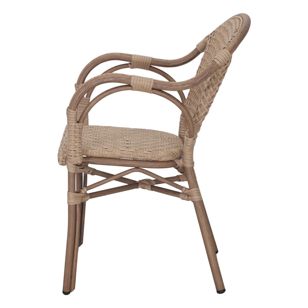 The Bacio synthetic rattan chair is a bistro-style piece that brings elegance and warmth to both indoor and outdoor spaces. Inspired by the classic Parisian terraces, its design combines tradition and functionality with resistant and modern materials. The tubular aluminum structure is finished in imitation bamboo, which gives it a natural aesthetic without sacrificing the lightness and durability of metal.