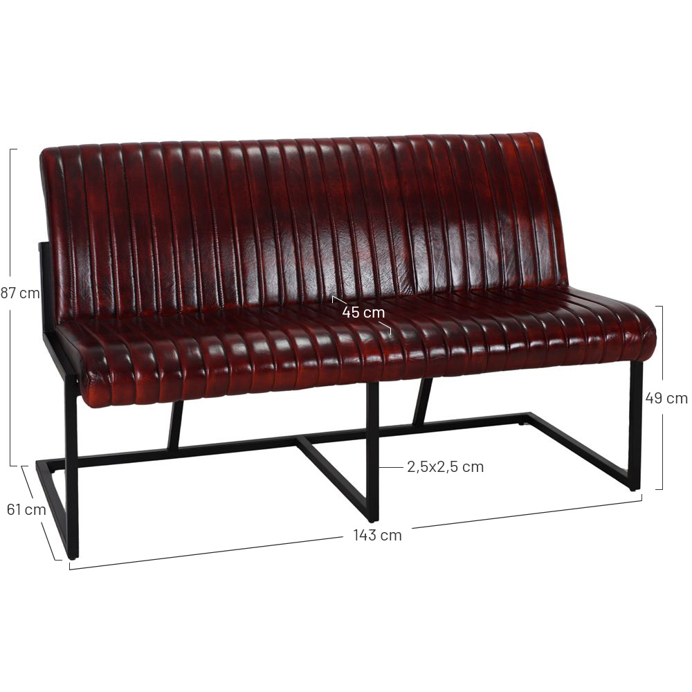 The Barny leather bench follows the Industrial style. It has a tubular steel frame with black powder paint finishing. Seat and backrest upholstered in leather.