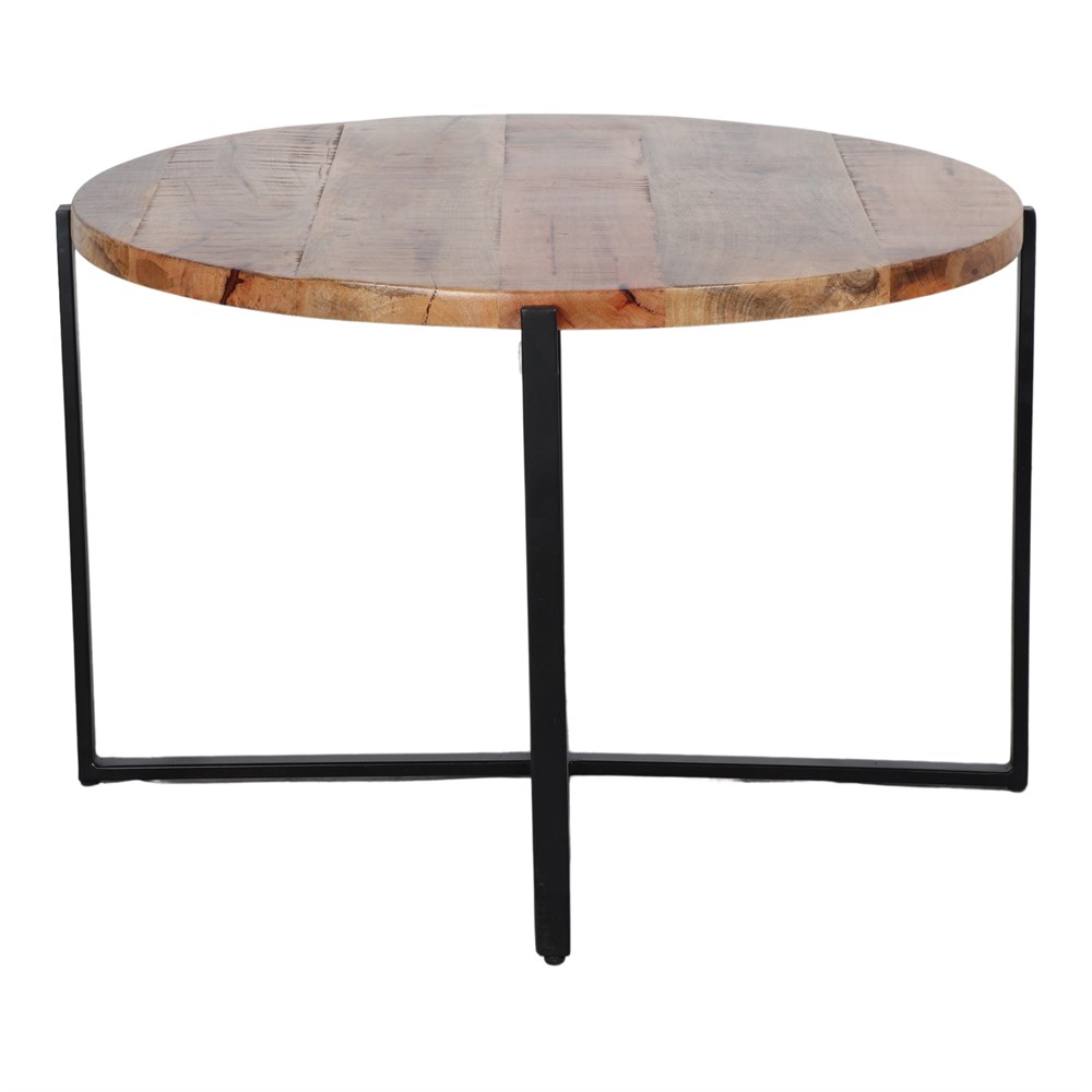 The BELLADONA side table is industrial in style, made of tropical wood, with a circular top and a metal frame finished in black powder paint.