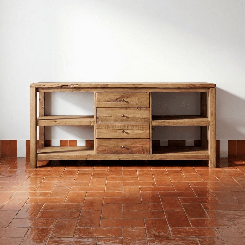 The Berliot wooden sideboard is a spectacular piece of rustic style. Made entirely of recycled solid pine wood, this sideboard has several shelves and 4 drawers with metal handles.