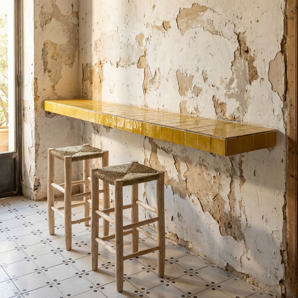 The Bordosa wooden kitchen stool is a piece in the Mediterranean rustic style, handcrafted from laurel wood. Its seat is made from woven natural palm leaves, giving it an extra organic touch.