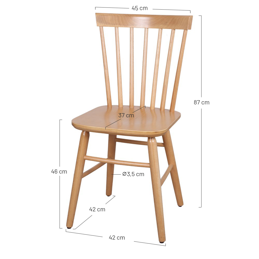 The Coventry wooden chair clearly follows the Windsor – Ercol style. Made of turned beech wood, it’s ideal for Nordic or Rustic style spaces, and it’s perfect for home or for catering premises. It’s a really easy cleaning and maintenance chair thanks to its finishing. This wooden chair will provide distinction and elegance; it’s a classic piece that never goes out of style.