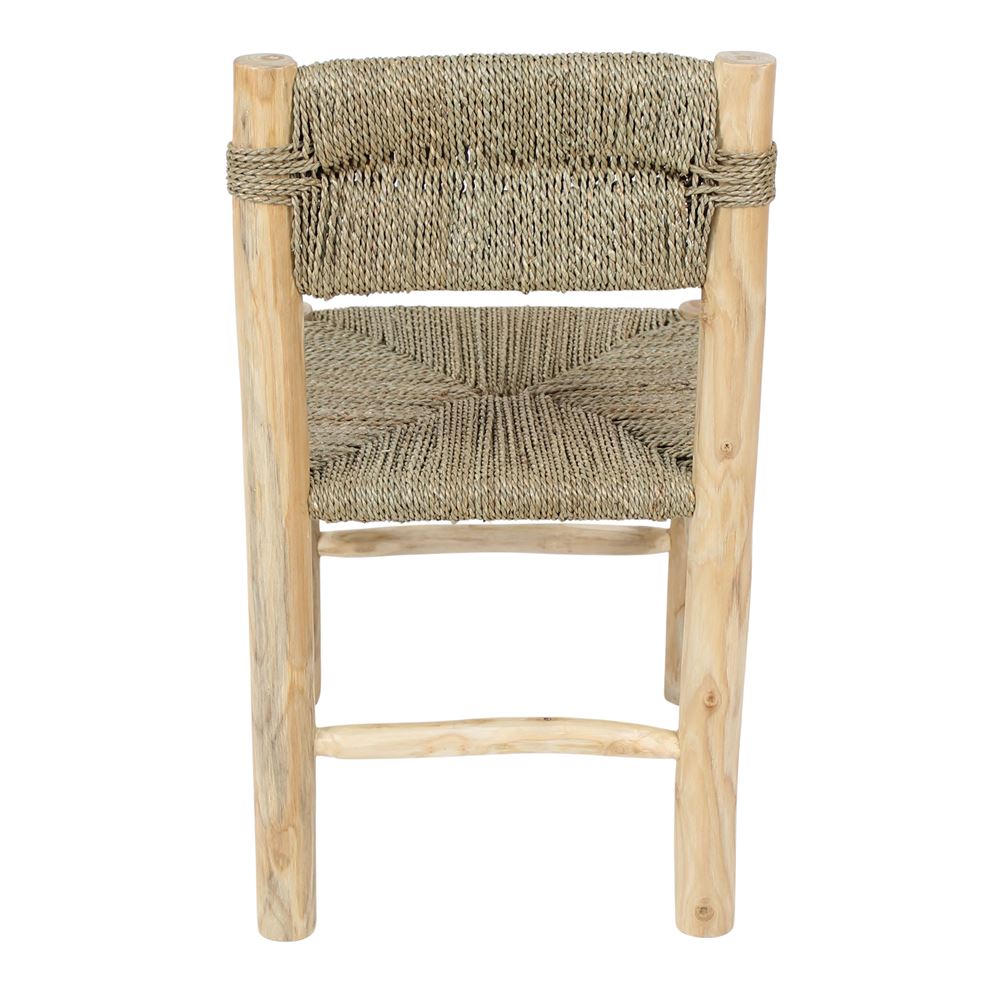 The Delanay tropical wood chair combines the strength and beauty of natural wood with the freshness and lightness of natural marine fiber rope. Its structure, made of solid tropical wood, stands out for its durability and warm grain, which give it an authentic and timeless character.