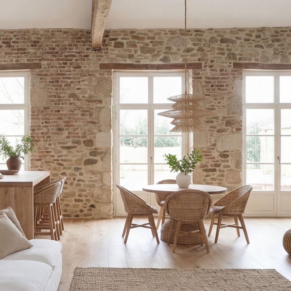 The seat and backrest are made of woven synthetic rattan, a material that perfectly mimics the warmth and texture of natural rattan, but with the advantage of being much more resistant to moisture and wear. This mix of materials creates a fresh, light, and welcoming design, ideal for those looking for furniture that brings a relaxed and timeless feel.