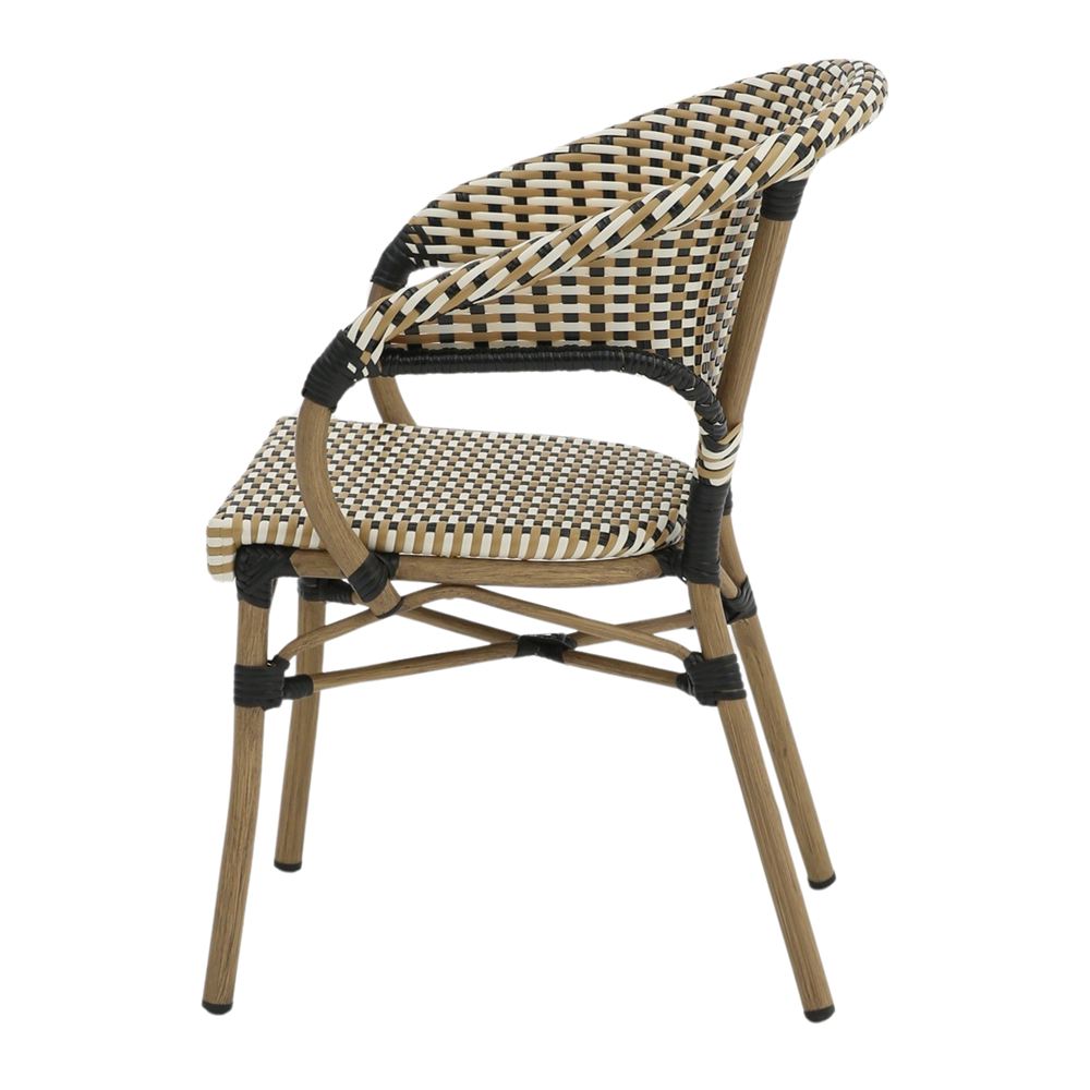 The seat and backrest are made of braided synthetic rattan pith, a material specially designed to withstand the elements, providing flexibility, comfort and a handcrafted finish reminiscent of traditional European deck chairs.