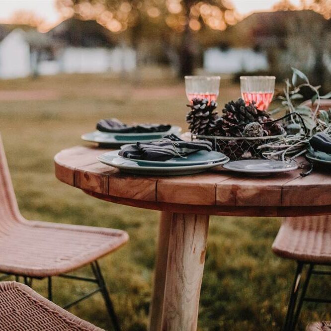 The Millery wooden table follows the Rustic style. It’s a round table made of solid teak wood.