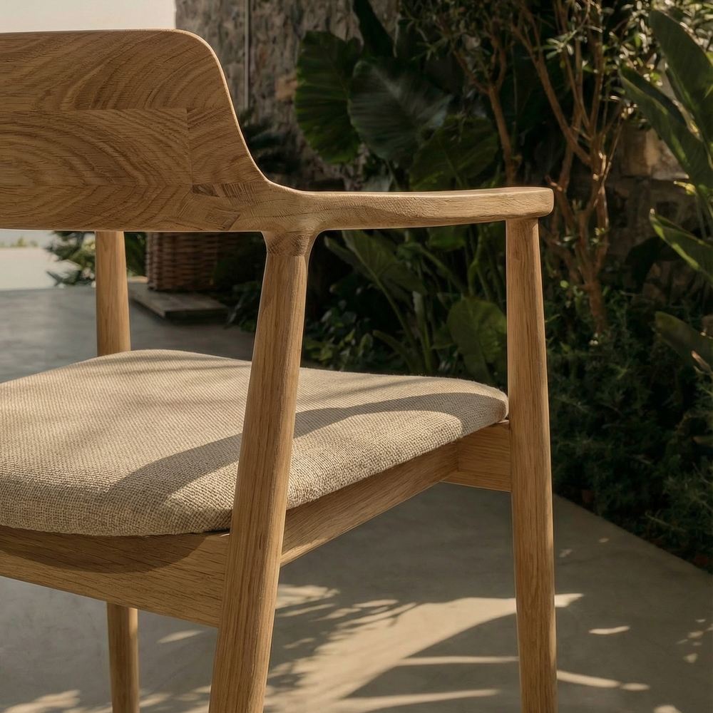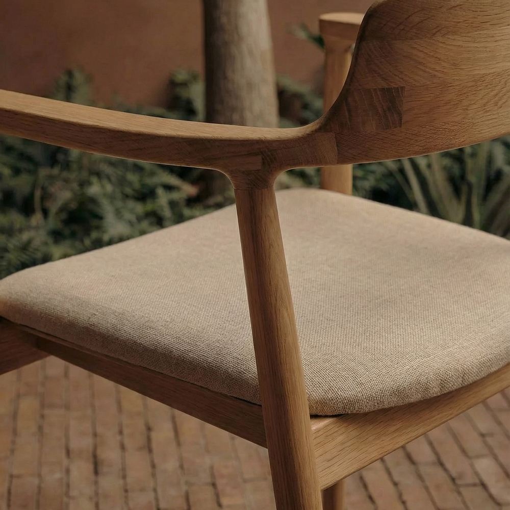 The textile upholstered seat increases comfort and adds a touch of sophistication to the ensemble. Thanks to its versatile design, the Orleans chair adapts easily to different decorative styles, from contemporary dining rooms to rustic-inspired or minimalist living rooms. Its ergonomic shape and the balance between natural materials and functional details make it a perfect choice for both home and professional spaces that seek to convey closeness and style.