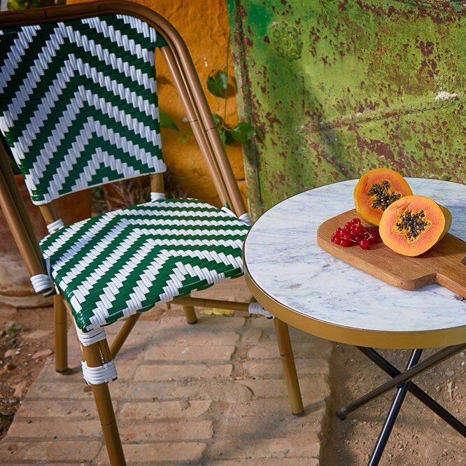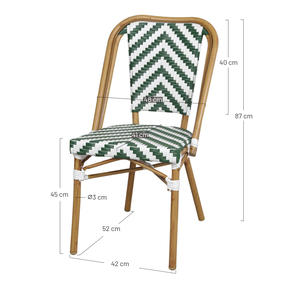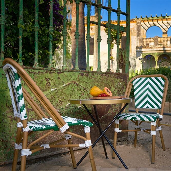Sit on one of the biggest trends of this season with our Pacific outdoor chair, made of aluminium with imitation rattan finishing. Synthetic rattan is now arriving to our indoor spaces and that’s not a surprise: this solid fabric gives texture to the chair’s look, and it’s been used on several iconic designs of the history of decoration. In this outdoor chair, synthetic rattan provides a more contemporary look than traditional rattan, and that makes this chair so easy to maintain. This chair is perfect for a patio, a terrace or a garden. You can combine it with other Bistró estyle furniture to get the perfect combination. Its unique design is the perfect recipe to an original piece of furniture that will give your space a parisienne look.