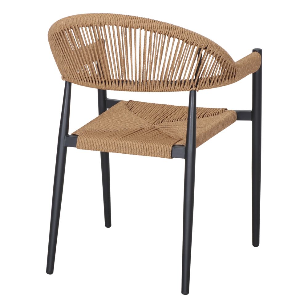 The black paint finish not only adds sobriety and modernity, but also provides a durable protective coating against outdoor conditions. The seat and backrest are made of braided polyester rope, a material resistant to UV rays and humidity, which also offers a pleasant feeling of comfort and visual appeal thanks to its handcrafted braiding.
