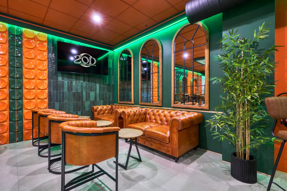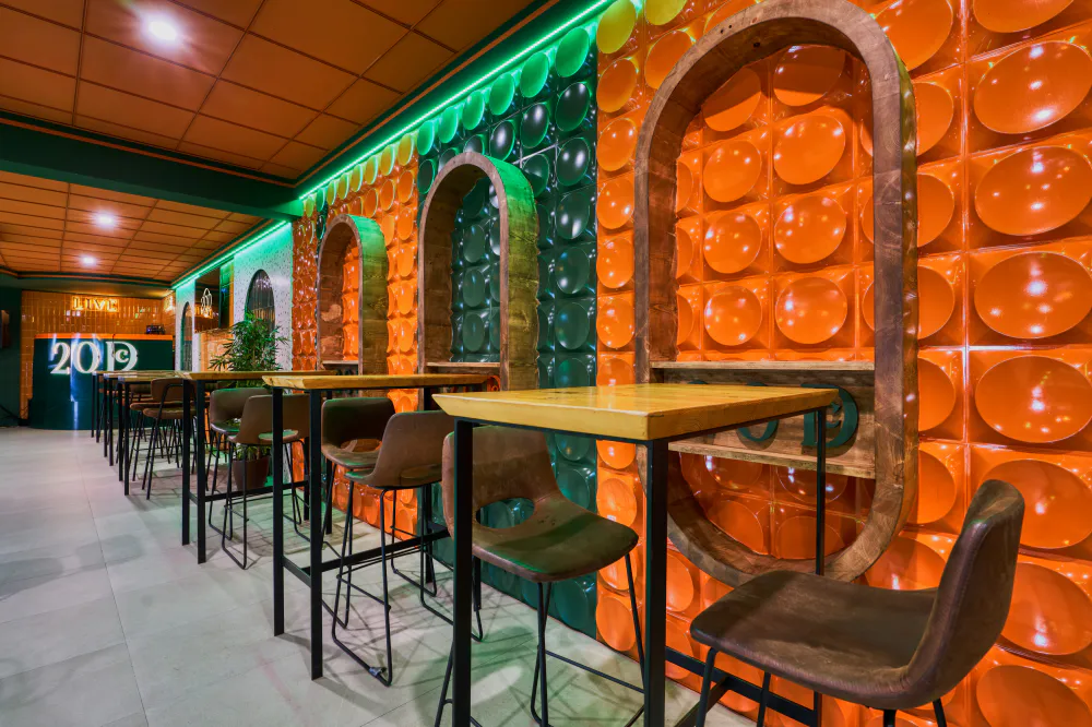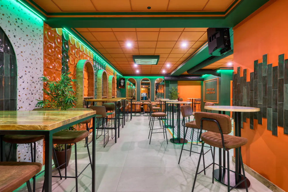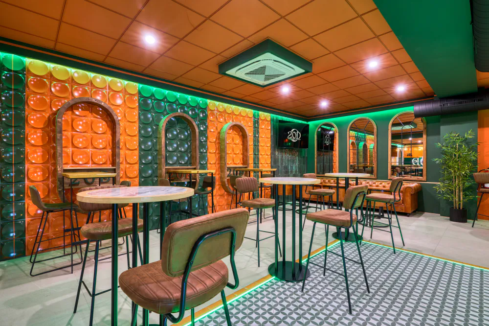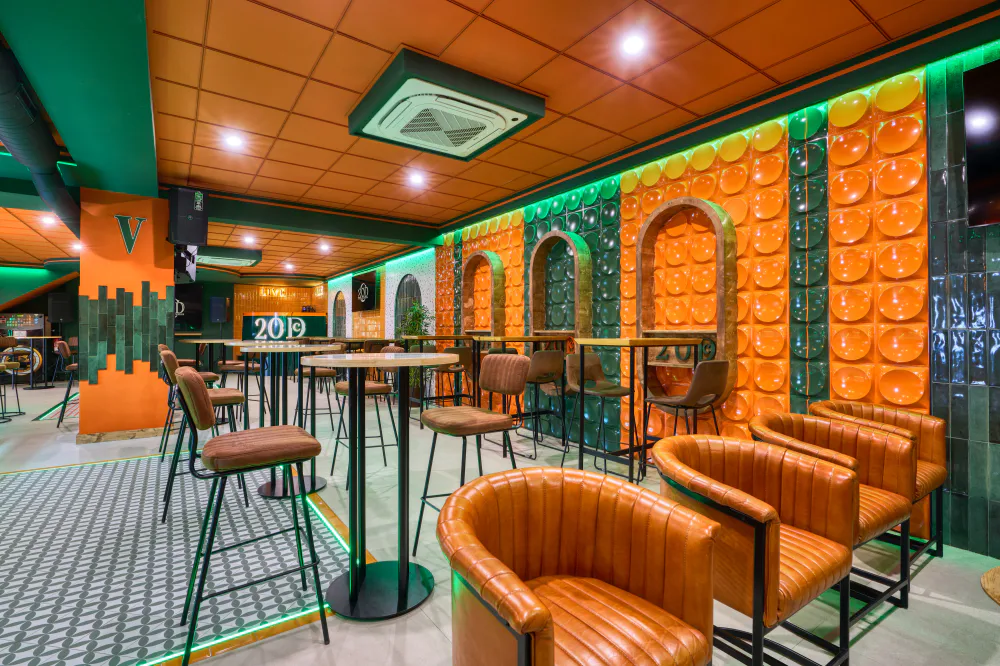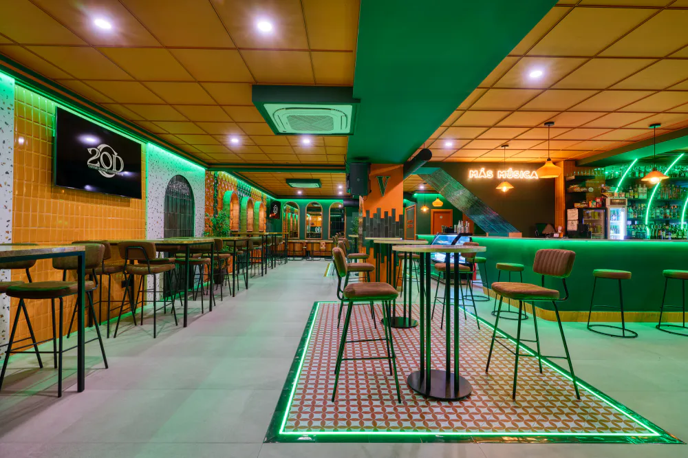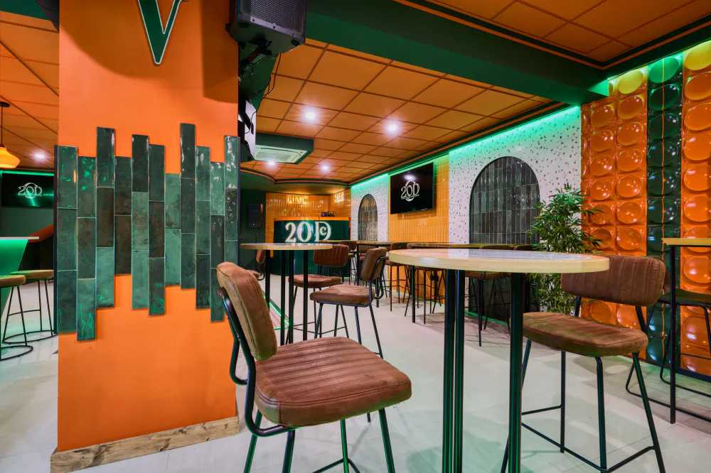 20DC, short for 20 de Cañas, is located in Las Cabezas de San Juan and was conceived as a meeting place where music, drinks and design come together to offer an immersive experience. Its aesthetic is defined by a palette of bold colours, dominated by greens and oranges, and integrated ambient lighting that creates different atmospheres within the venue.