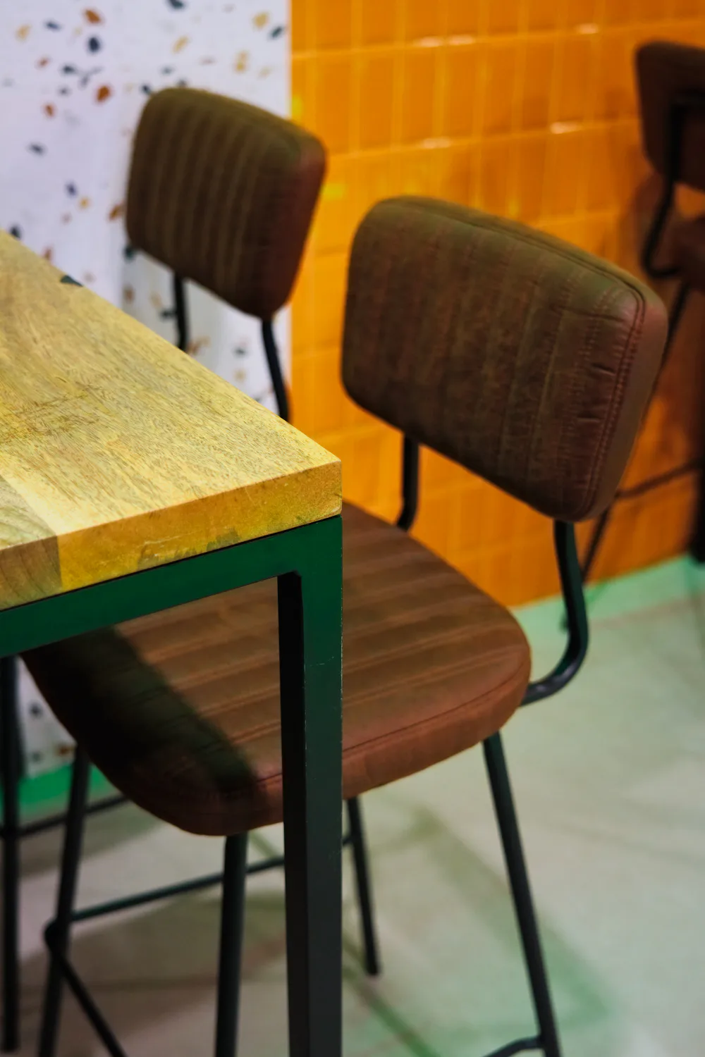 The recent refurbishment of the furniture has enhanced both the look and feel of the space without compromising its identity. Leather-upholstered chairs and high stools, alongside tables with wooden tops and metal frames, lend a distinct industrial feel and strike a balance between robustness and warmth, reinforcing the overall character of the space.