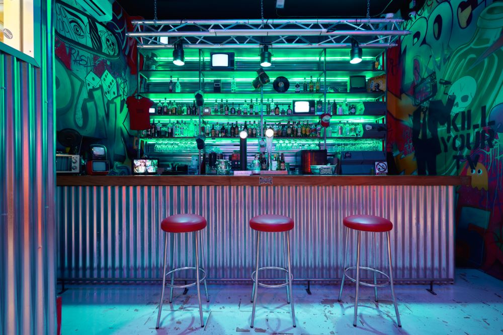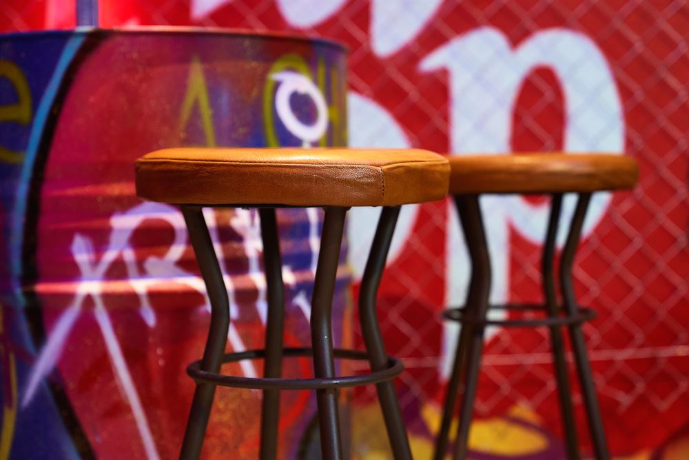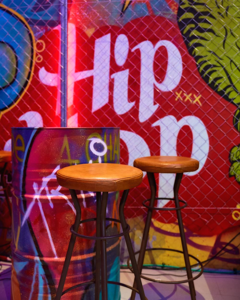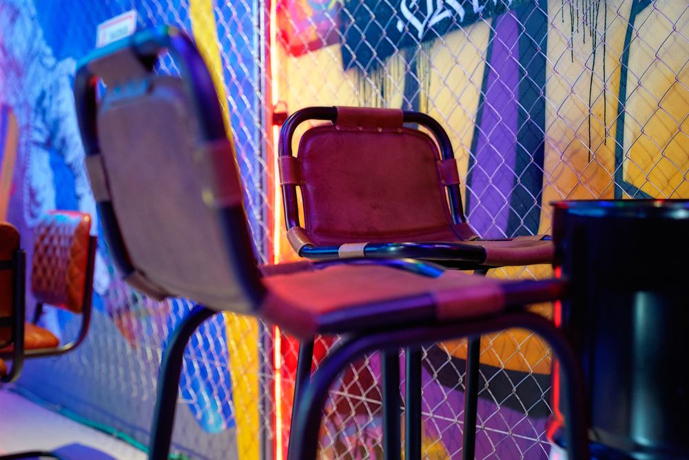 In addition to the mural painting, we can find more evidence of the urban industrial style, such as the neon lighting in fluorescent colors, the corrugated sheet metal and metal mesh cladding or the furniture, for which Marcos has used pieces from MisterWils.