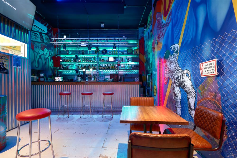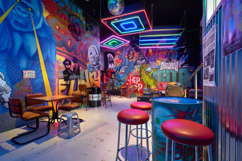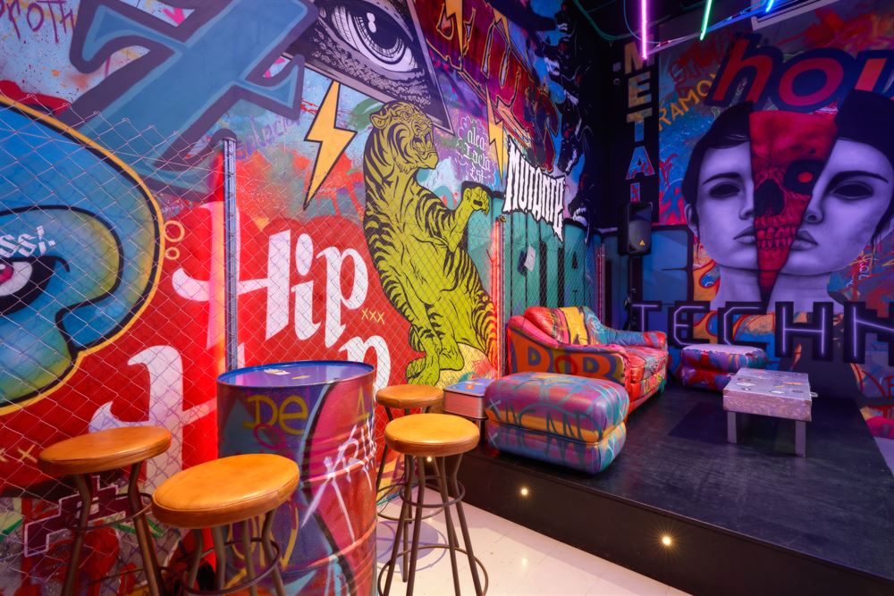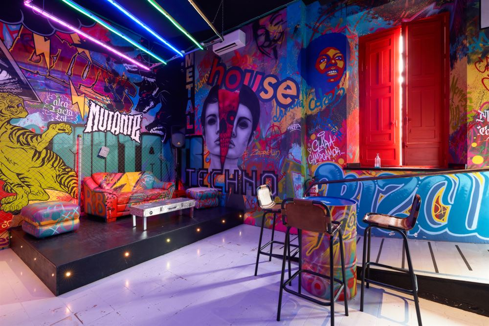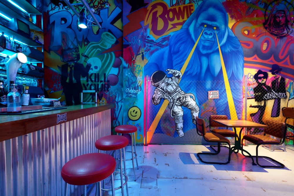 The project, which has consisted of a radical change, pays homage to the premises of Berlin in the 90’s with an eminently urban style. Its walls are full of Street Art with a multitude of references to the undergroundhave been painted by Marcos, one of the greatest experts in decorative mural painting and airbrushing in Seville.