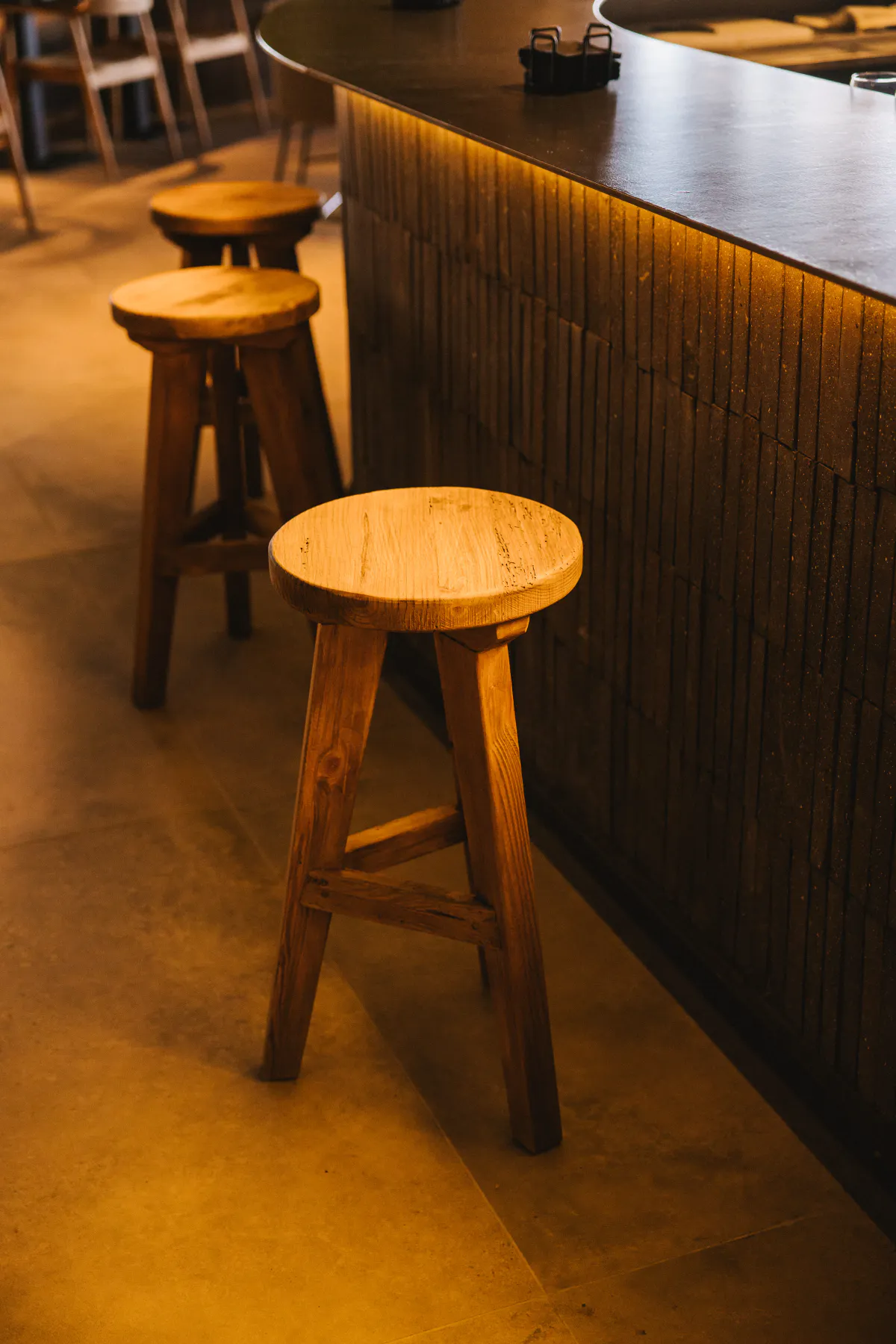 The bar area creates a more lively atmosphere, with wooden stools set against a long counter clad in ceramic and wood, providing a more informal gathering spot within the restaurant.