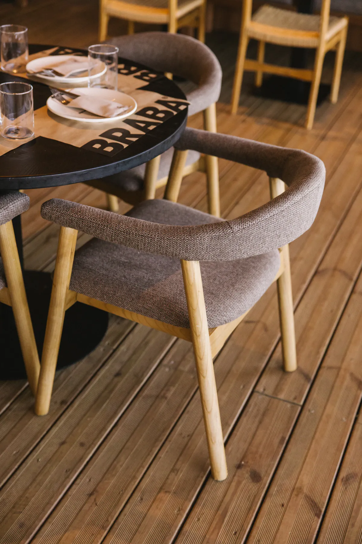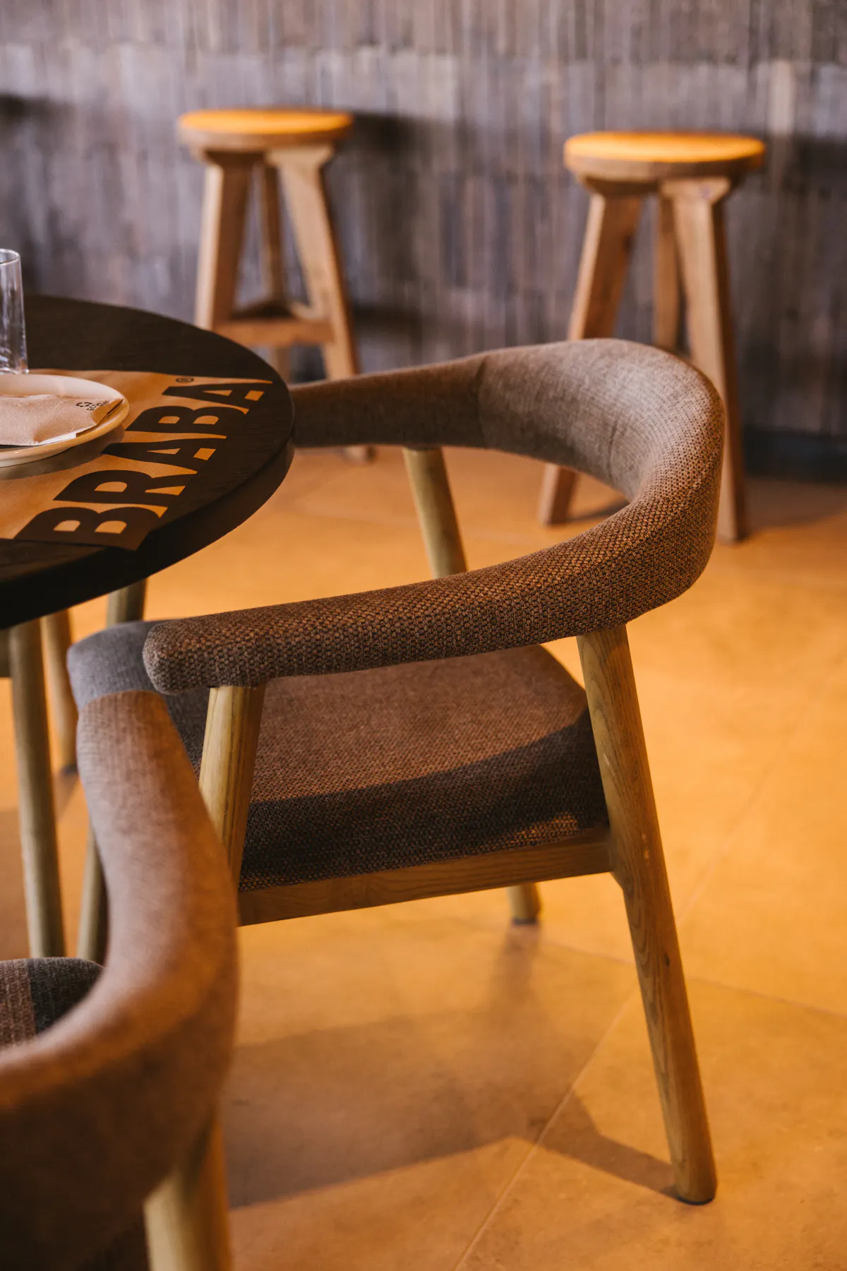 The chosen furniture reinforces this identity, creating a relaxed atmosphere that invites guests to enjoy their meal. Wooden chairs upholstered in natural tones predominate, combined with wooden tables with metal legs, as well as long benches with large cushions that provide comfort and help to organise the space. This ensemble strikes a balance between warmth and solidity, facilitating a flexible layout that adapts to all kinds of gatherings.