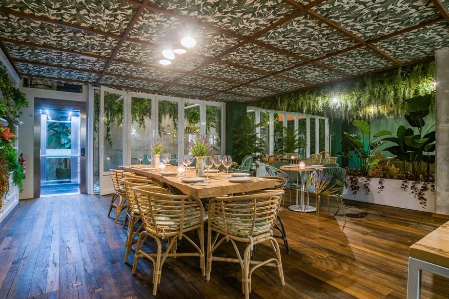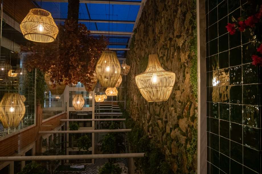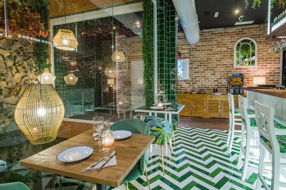 Going down the staircase is no less striking, a wall of bright green tiles shows us the way to the first floor, which not only gives access to the terrace. It also takes us into a new space with large tables and vine ceilings. A more intimate and relaxed space, perfect for leaving aside the hustle and bustle of everyday life. Even in the toilets there is no lack of detail. They have turned the washbasin into a stone fountain with golden faucets and wooden shelves.