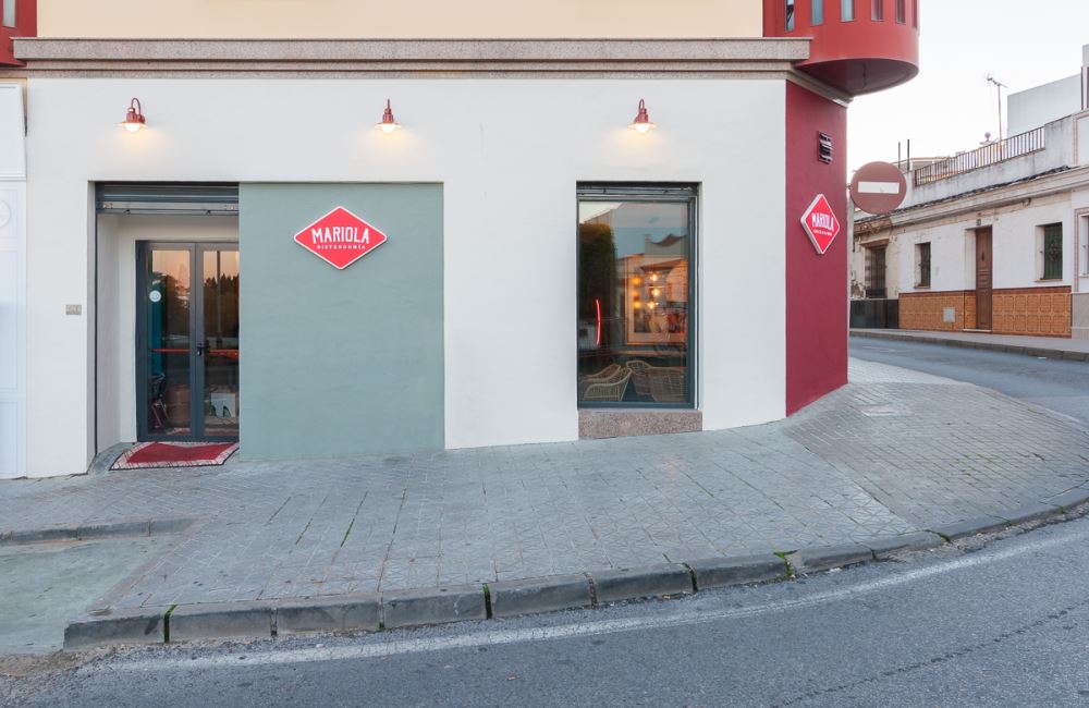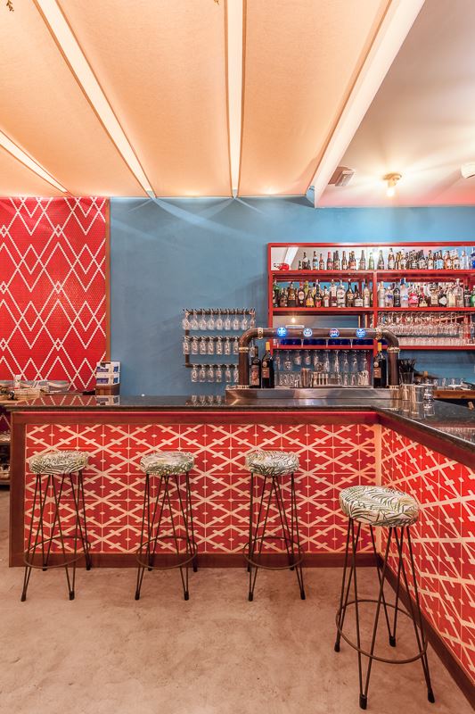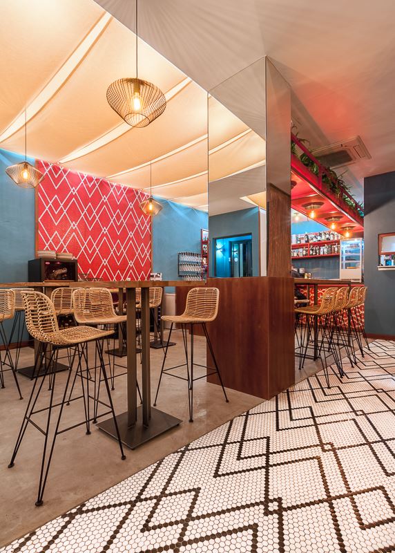 Once inside we have the possibility of heading towards the lower or main area, or staying to the right, where we find the area of low tables where the vinyl floor in red, white and wood colors serves as an introduction to the chromatic range that will guide us through the rest of the place. In the lower and bar area are the high tables, where the routes and reserved areas are differentiated with gresite flooring, forming geometries with different colors and patterns and leaving the rest of the floor in polished concrete. This stoneware is also transferred to the wall in some areas, becoming one of the fundamental elements of the project and merging with the entire corporate identity and branding.