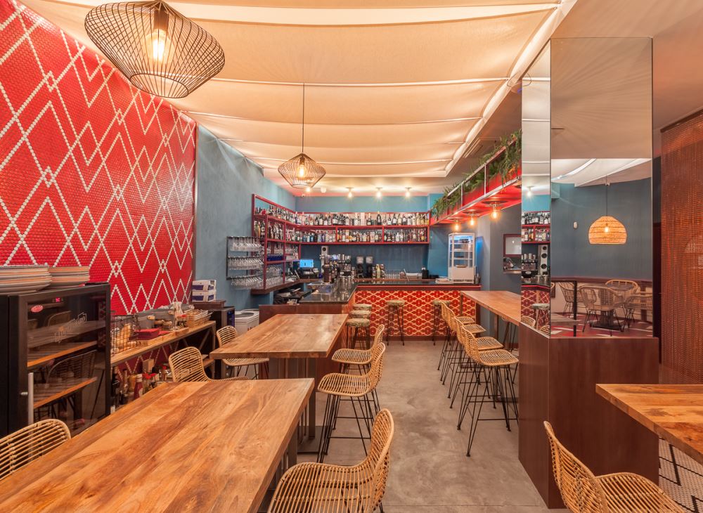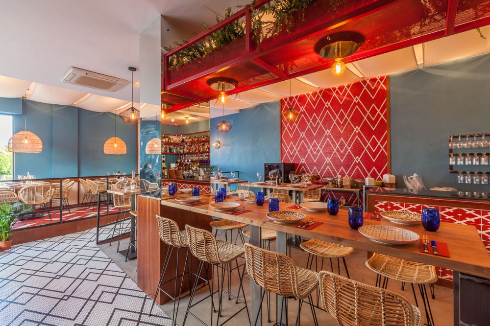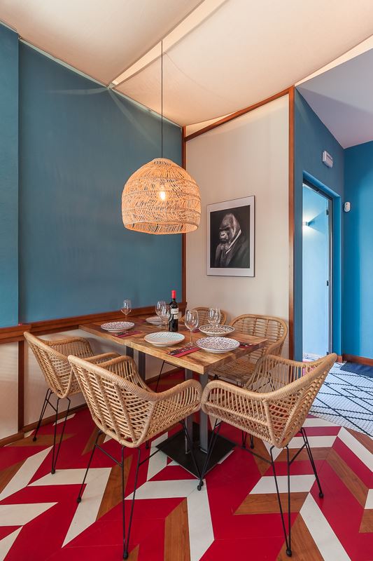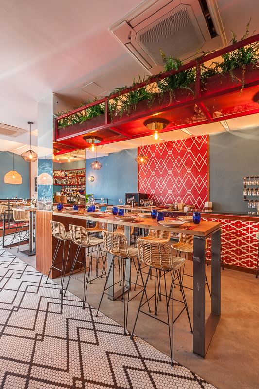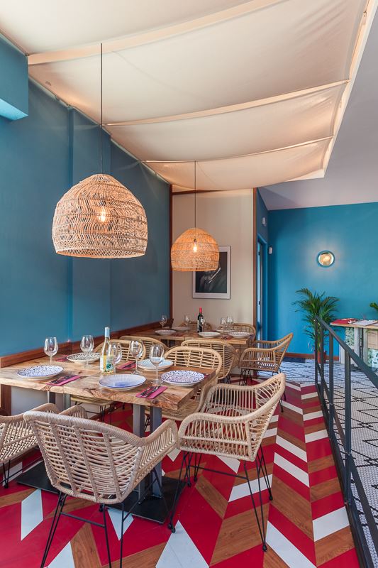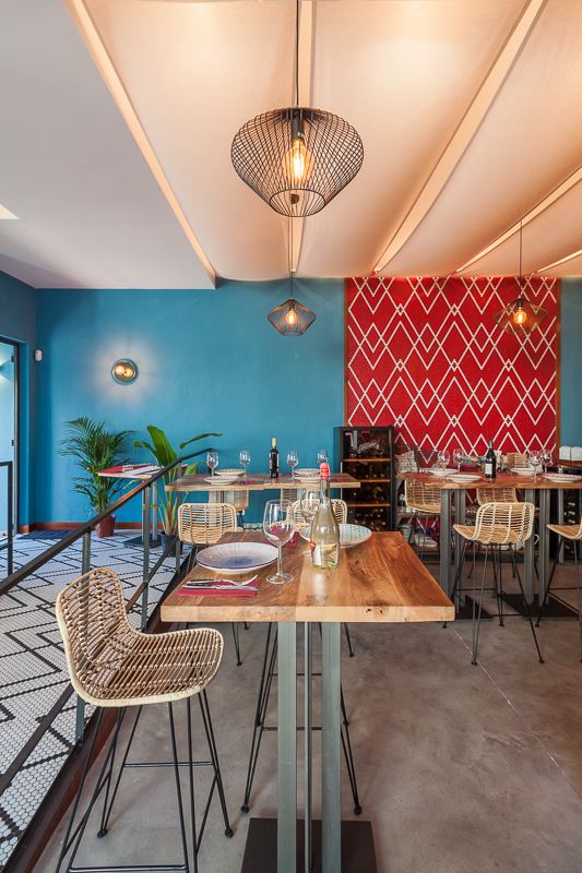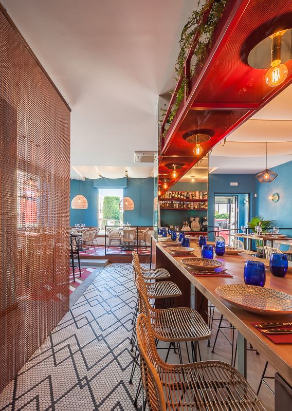 The first impression upon entering the restaurant is an elevated perspective of the entire premises, from which to get a clear idea of the ambience, the different areas and the decoration in shades of red and blue.