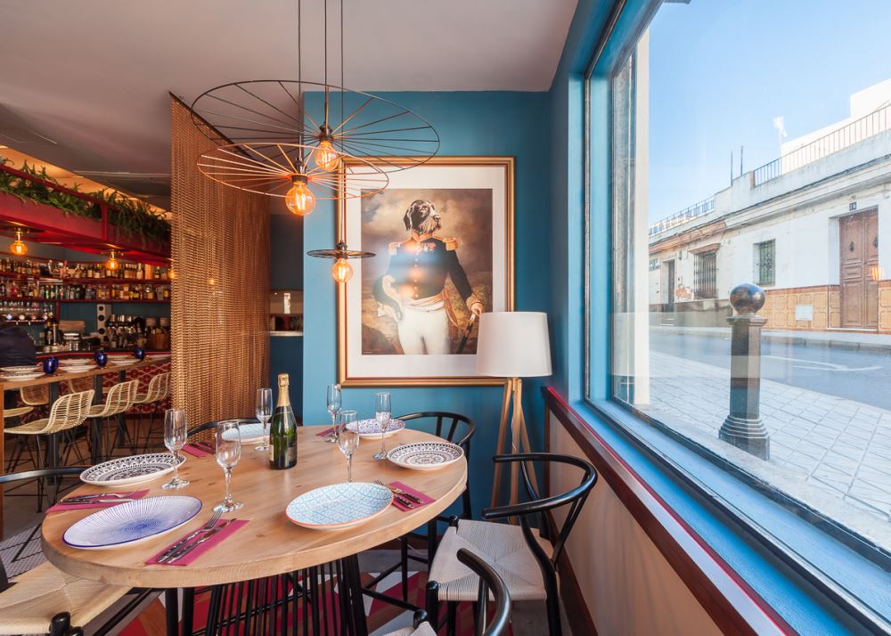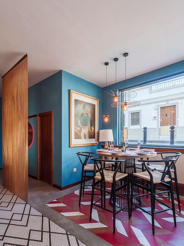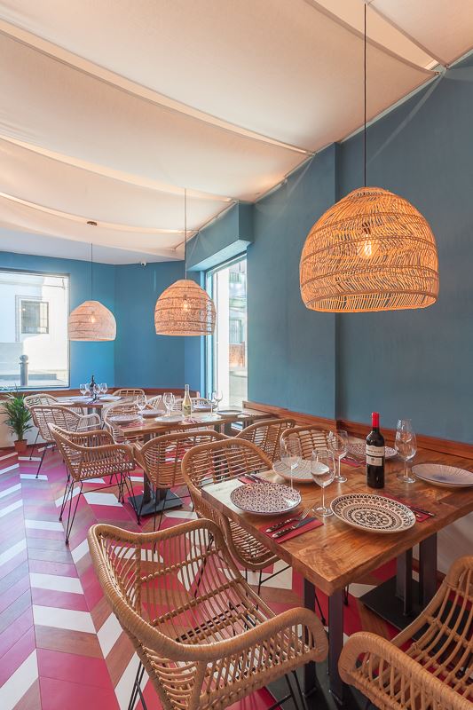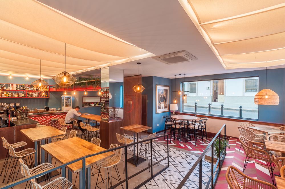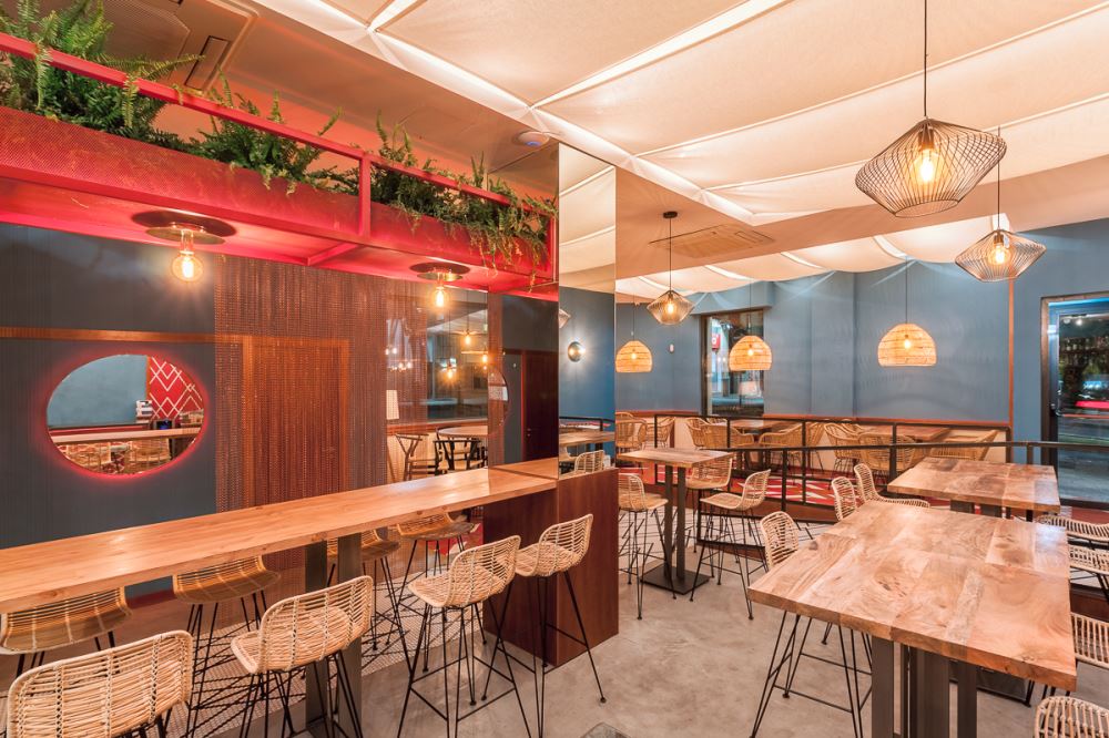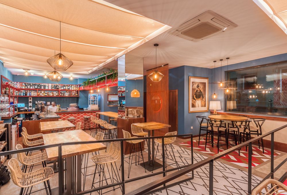 The first impression upon entering the restaurant is an elevated perspective of the entire premises, from which to get a clear idea of the ambience, the different areas and the decoration in shades of red and blue.