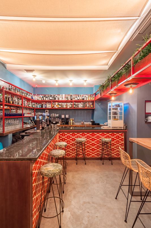 The bar area concentrates the predominant color of the premises: red, which bathes the structure of glassware and plants, the base of the bar and the office. Finally, some details such as copper chains and a circular mirror separate the lobby from the toilets.