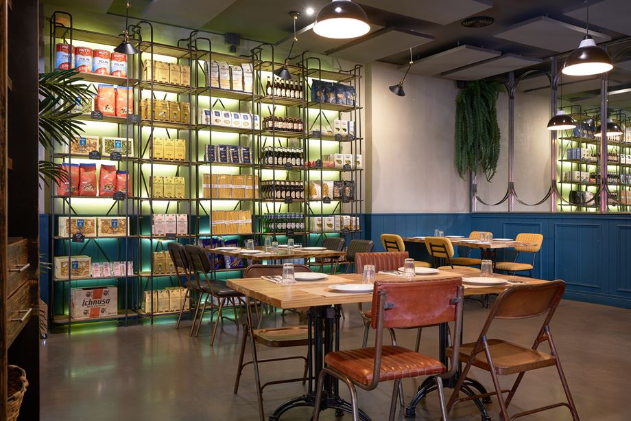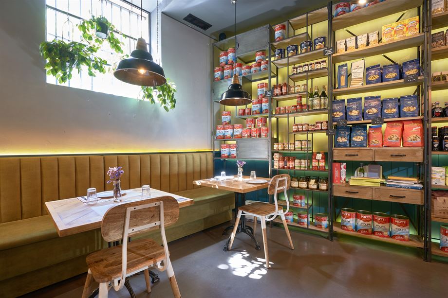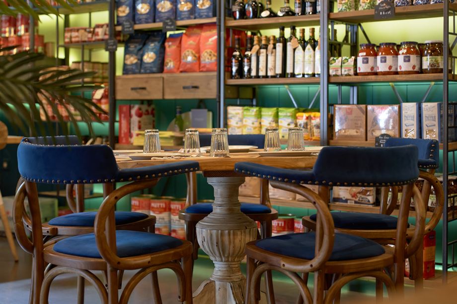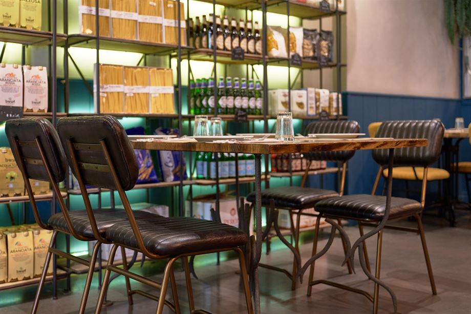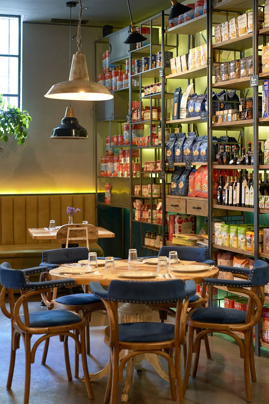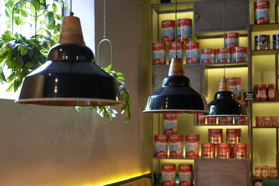 A large shelf dominates the main wall, where Italian products that you can take home are decoratively displayed.
