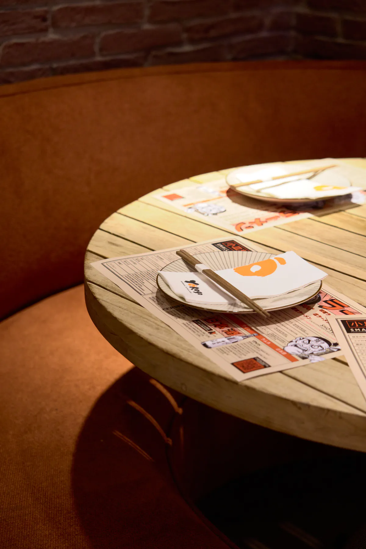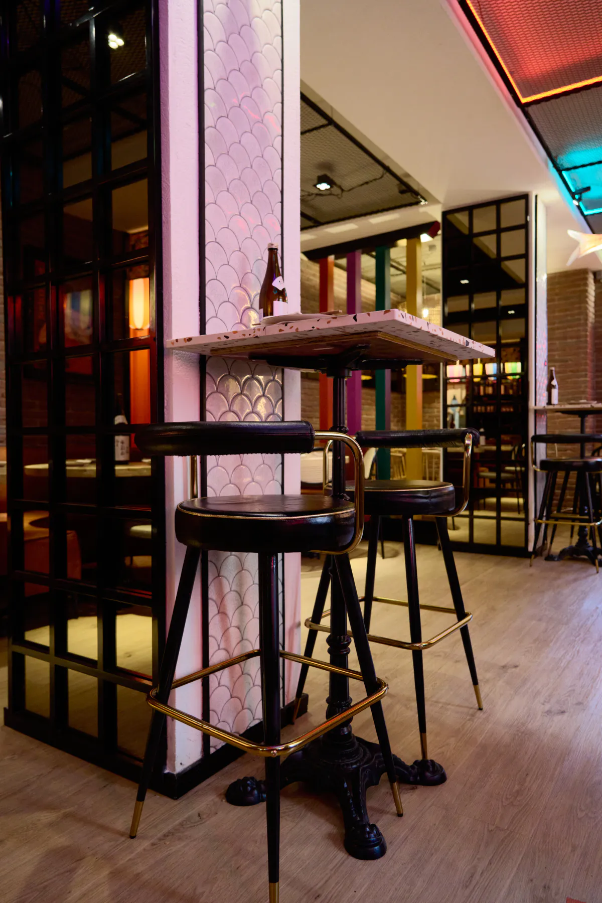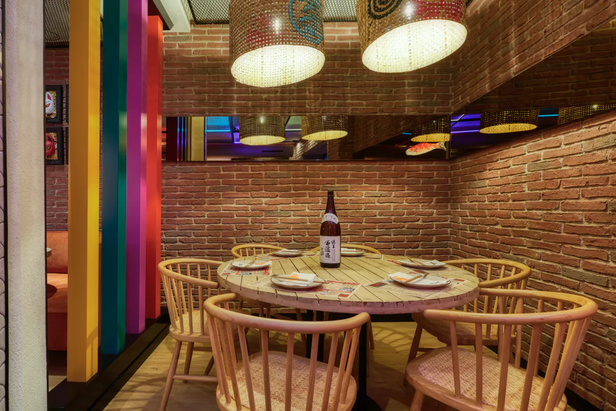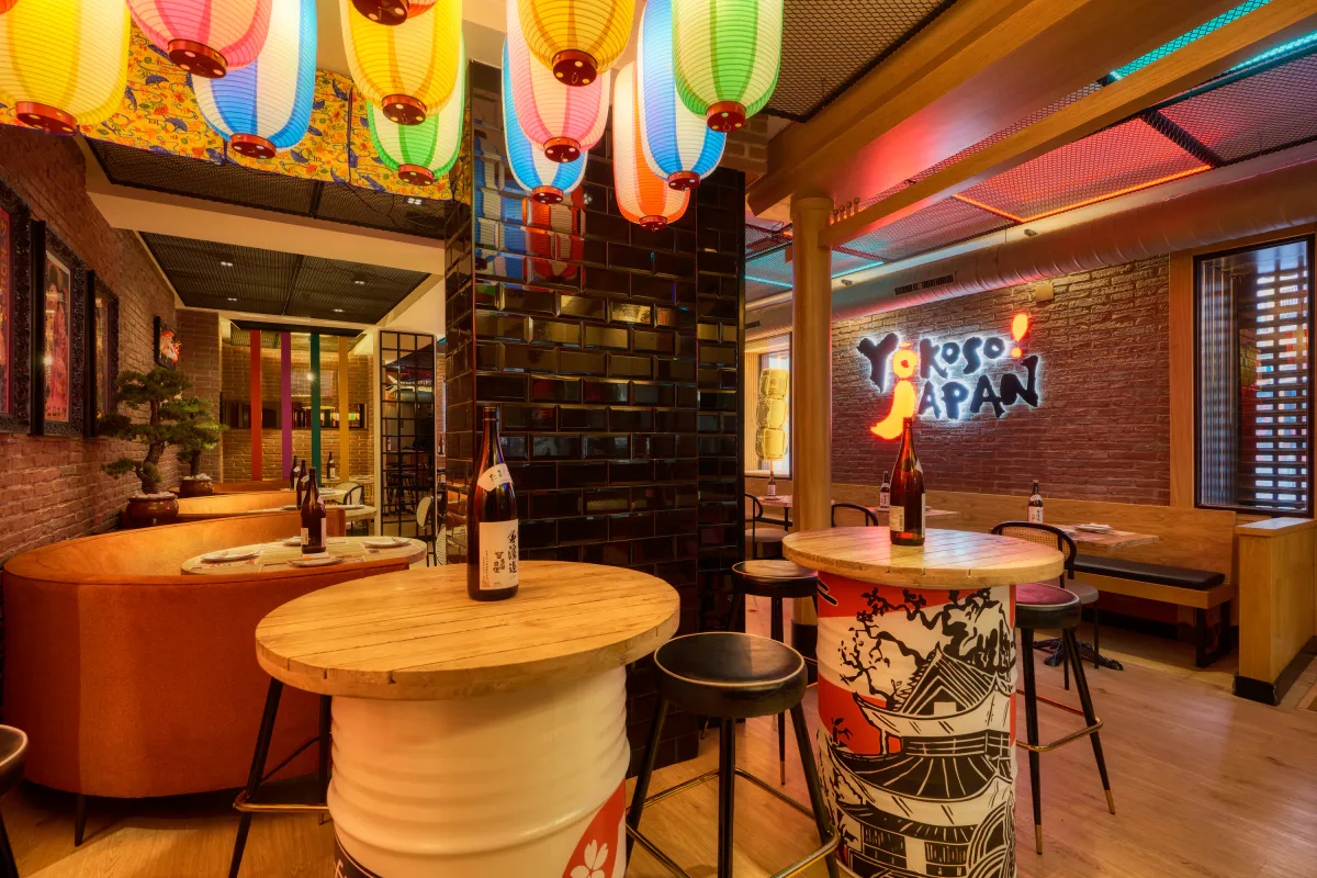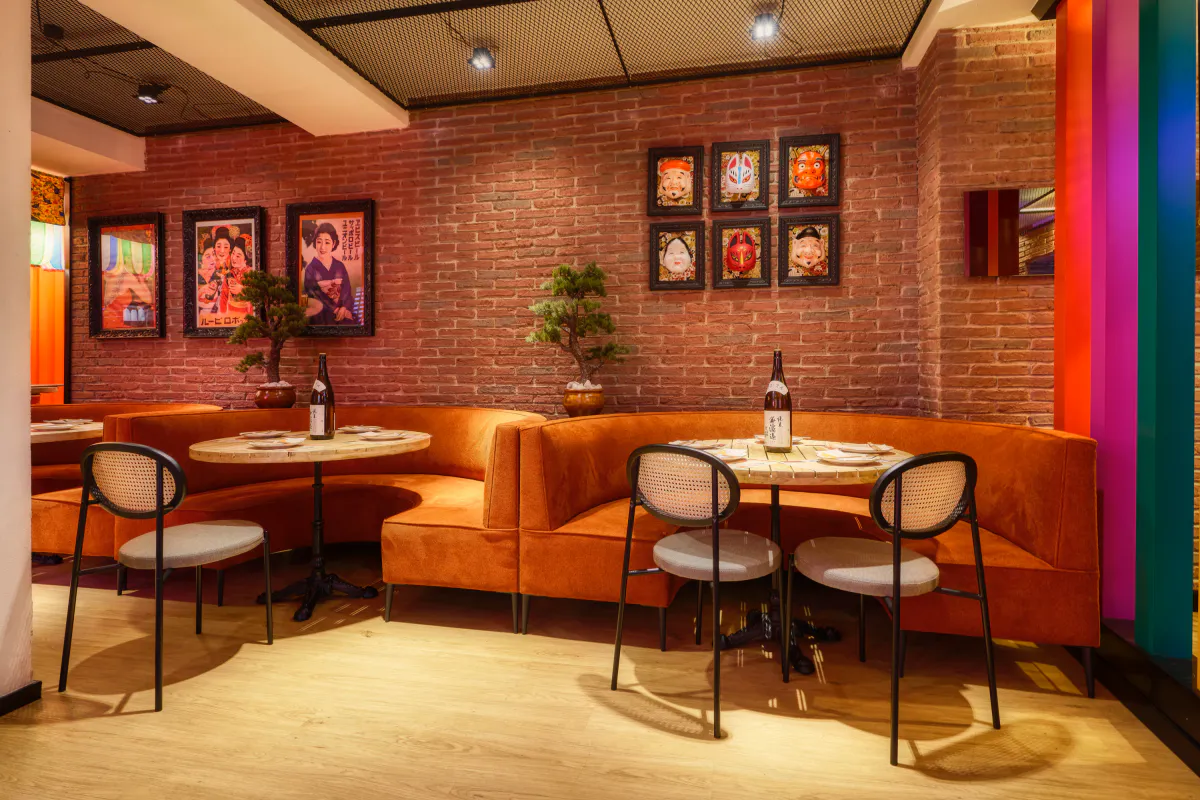 The decorative details complete the atmosphere and naturally reinforce the Japanese aesthetic. Illustrations, masks, sake bottles and subtle graphic touches add personality and a touch of playfulness, blending seamlessly with the rest of the space without overwhelming it. Each element is designed to enhance the experience without distracting, creating a balanced and instantly recognisable environment.