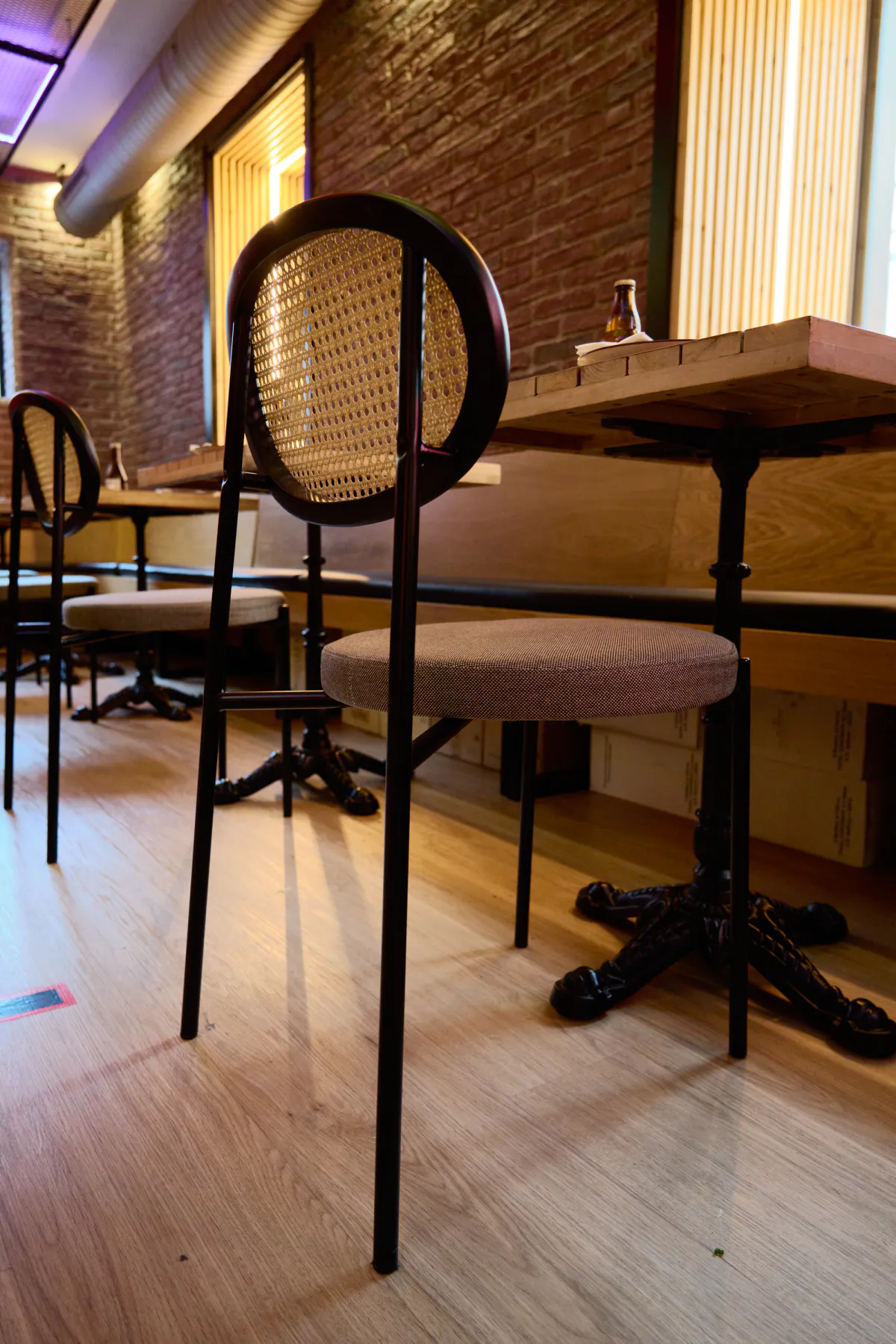 El mobiliario tiene un papel clave en la configuración del restaurante y en la comodidad del usuario. Mesas con tapas de madera y pies metálicos se combinan con sillas tapizadas de estructura metálica y respaldos de cannage en ratán, además de bancos curvos tapizados en tonos cálidos. Esta selección de piezas aporta coherencia estética y funcionalidad, adaptándose al ritmo del local y al uso diario. La disposición del mobiliario permite diferentes formas de disfrute, desde comidas rápidas hasta encuentros más tranquilos y prolongados.