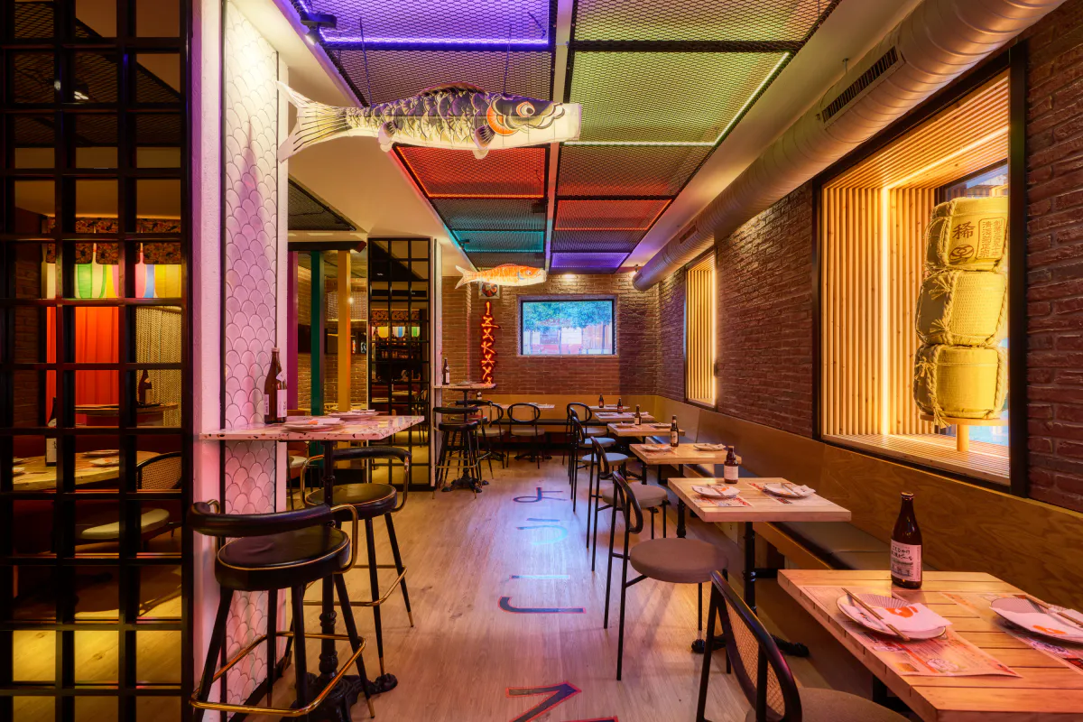 The restaurant’s interior is built around a balanced combination of materials and visual elements. The exposed brick walls lend character and provide an industrial aesthetic foundation that ties in with the concept of traditional izakayas, reinterpreted through a contemporary lens. Against this backdrop, graphic elements, signage and decorative details inspired by Japanese culture are integrated, lending the venue its identity and reinforcing its urban character without being overbearing.