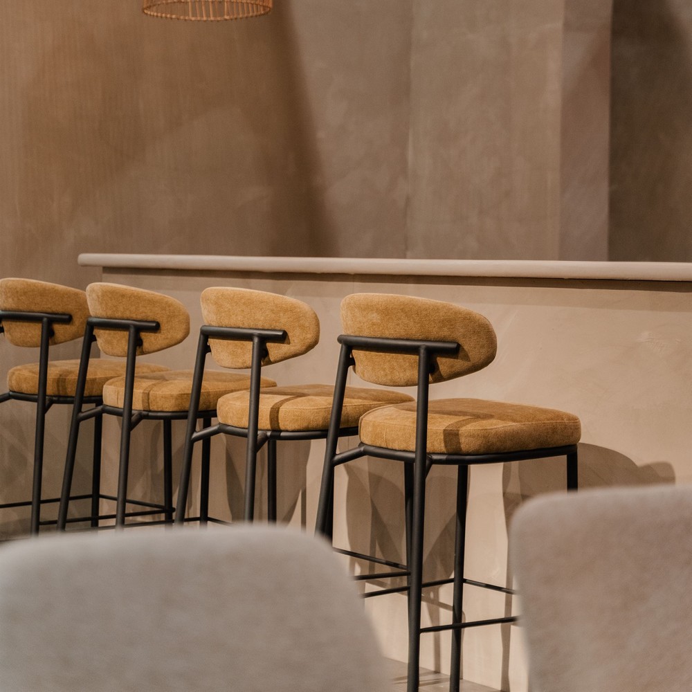 The seat and back of the Redel upholstered high stool are upholstered in a high-quality textile, which not only adds comfort but also a soft, welcoming texture to the design. This detail, along with the clean lines of its structure, make the stool a versatile choice for kitchens as well as for bar counters or meeting areas in modern offices.