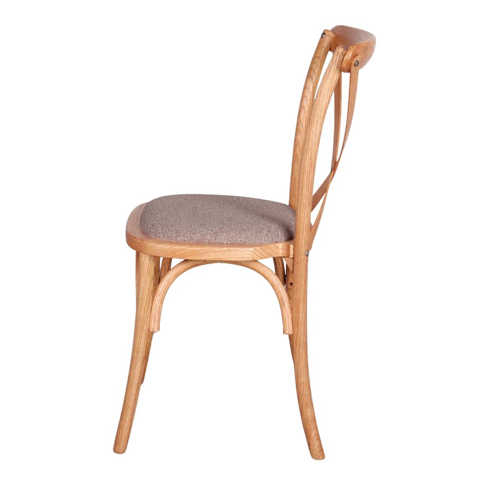 Take a seat in one of the biggest trends of the season with our Lotus upholstered wooden chair. This Bistro style wood chair has a paddle back, or cross back. The seat is upholstered in fabric, making it a truly comfortable chair. Its combination with elm wood and its comfortable curves are the recipe for original pieces that will give a very Bistró touch to your dining room.