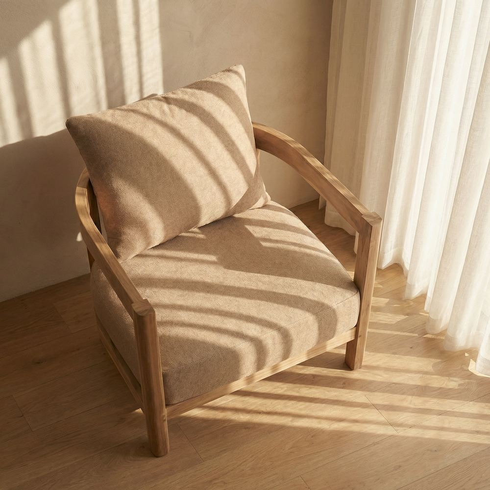 The armchair has cushions upholstered in tan fabric, a neutral shade that harmonizes with the tone of the wood and adds comfort to the seat. The upholstery is designed to be soft to the touch and resistant to daily use, making this armchair a practical and cozy option.