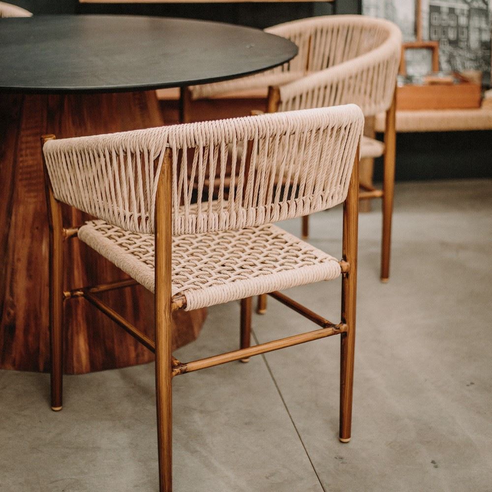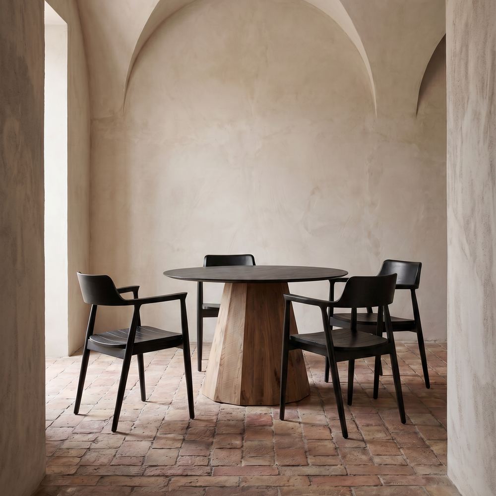 The Steffy wooden table follows the Japandi style. This round table has a recycled pinewood frame, and a plywood beveled tabletop with black powder paint finishing.