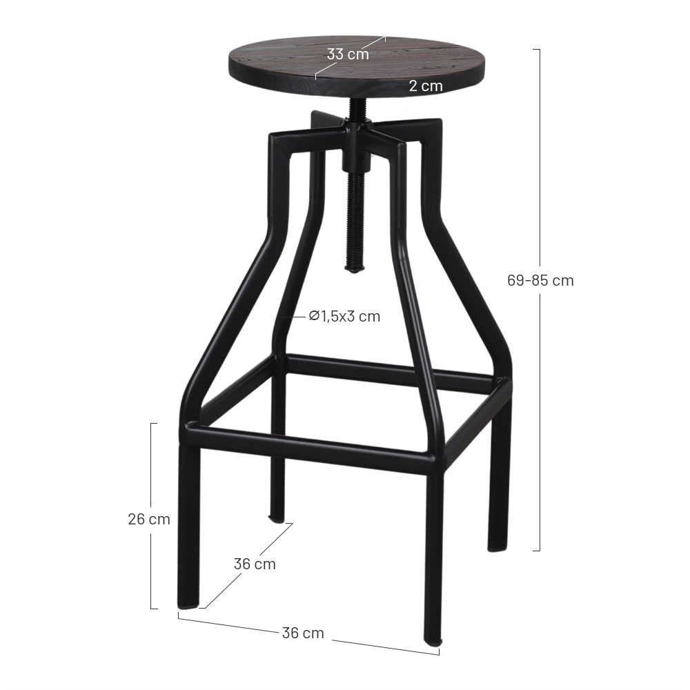 Base: 36×36 cm | Minimum height: 69 cm | Maximum height: 85 cm | Seat: Ø33 cm