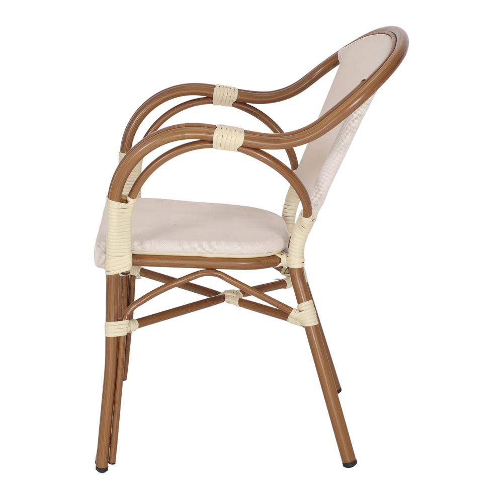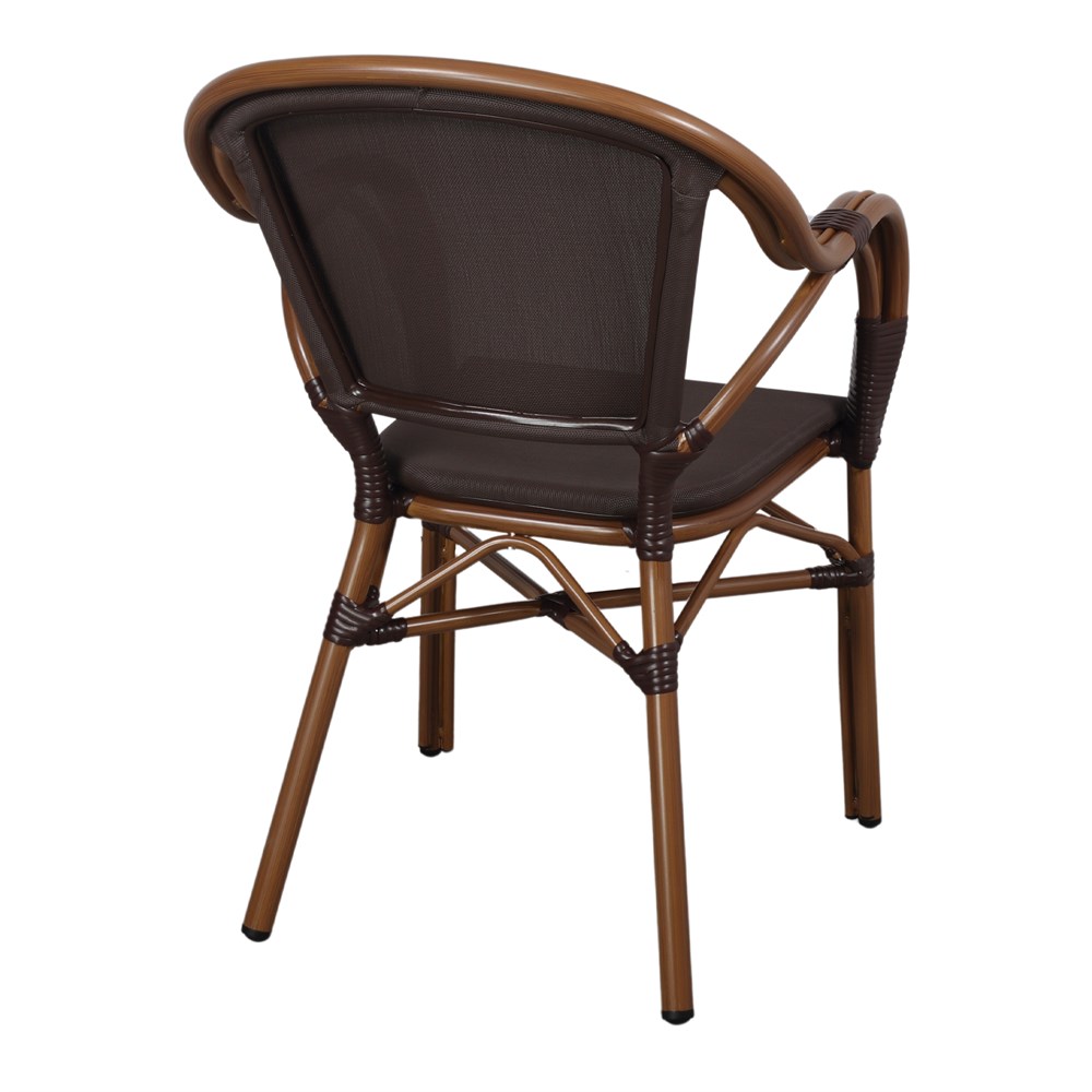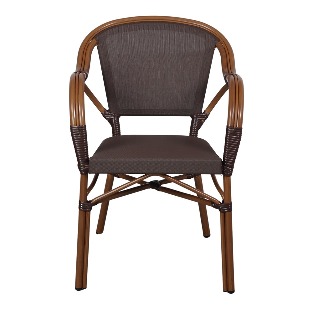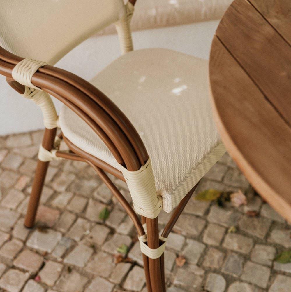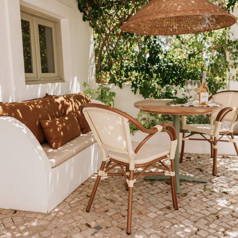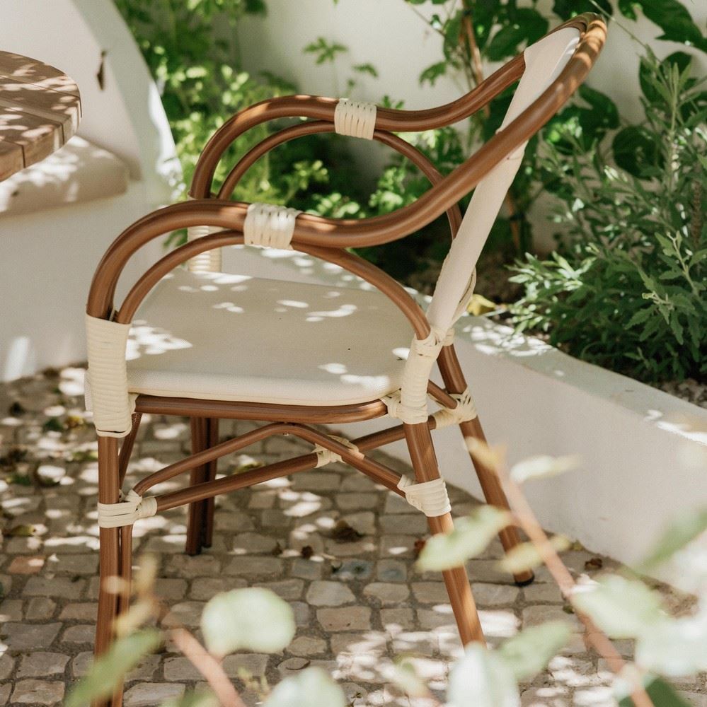 The Tender outdoor chair is perfect for gardens, patios, terraces, etc, to enjoy your comfort outdoors. A chair made of aluminum imitating bamboo, and upholstered in textilene for easy cleaning and maintenance. Bistro style, it is a great chair to recreate the peculiar Parisian cafes. A very firm and light chair thanks to the manufacturing material.