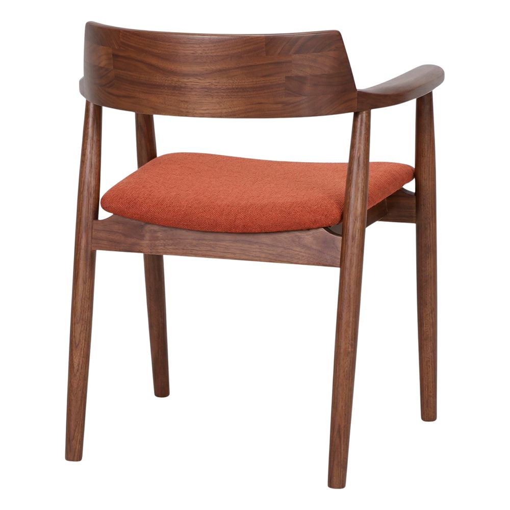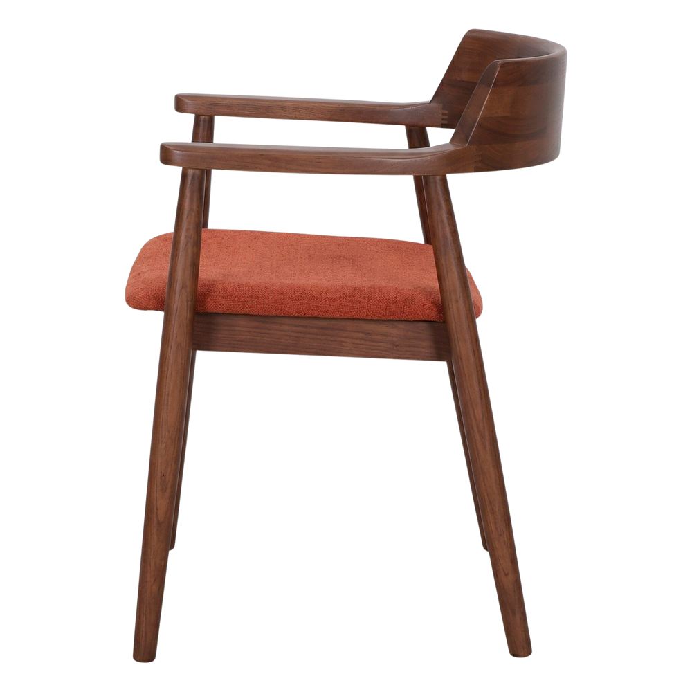 The seat upholstered in brick-red fabric increases comfort and adds a touch of sophistication to the overall look. Thanks to its versatile design, the Orleans chair adapts easily to different decorative styles, from contemporary dining rooms to rustic-inspired or minimalist living rooms. Its ergonomic shape and the balance between natural materials and functional details make it a perfect choice for both home and professional spaces that seek to convey closeness and style.