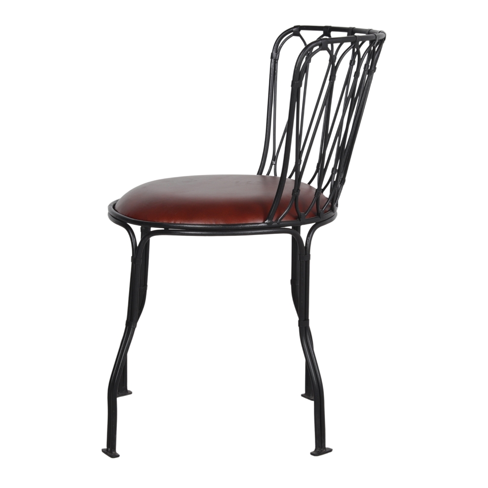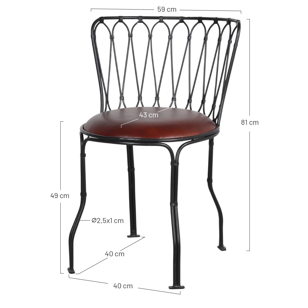 The Vilette metal and leather chair in vintage style is ideal for decorating a room where this style predominates. Very striking for its sinuous shapes in the back, it has a brown leather upholstered seat, which brings elegance and comfort. This metal and leather chair combines great with natural fibers or wood and is perfect for both home and hospitality. A functional and easy to maintain chair.
