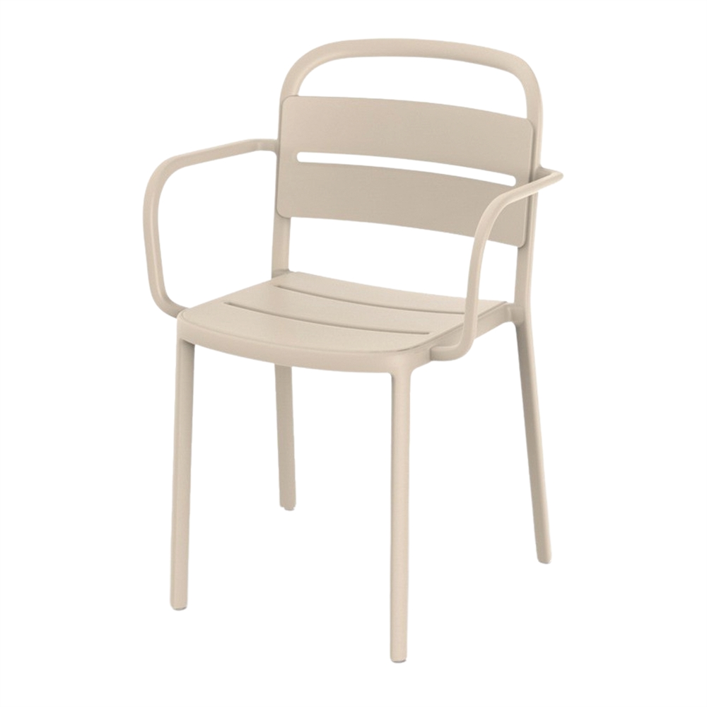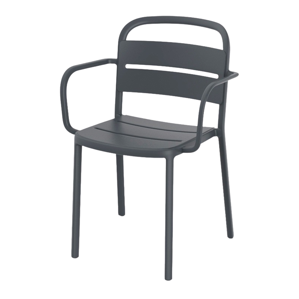 Zeren stackable outdoor chair with armrests.