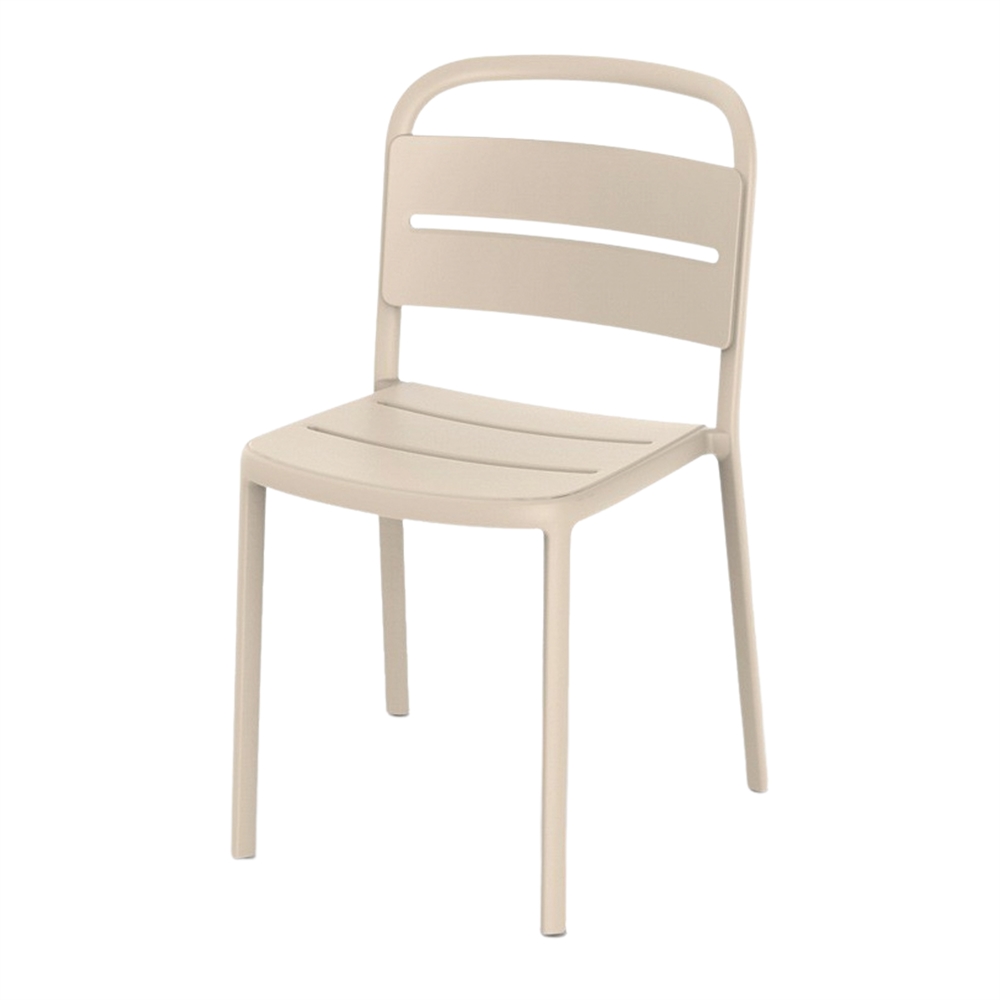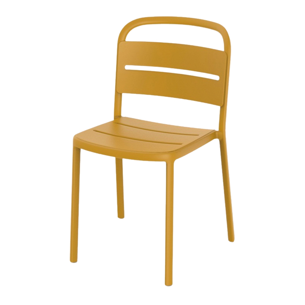 Stackable chair for indoor and outdoor use. Polypropylene frame and seat. UV protection.